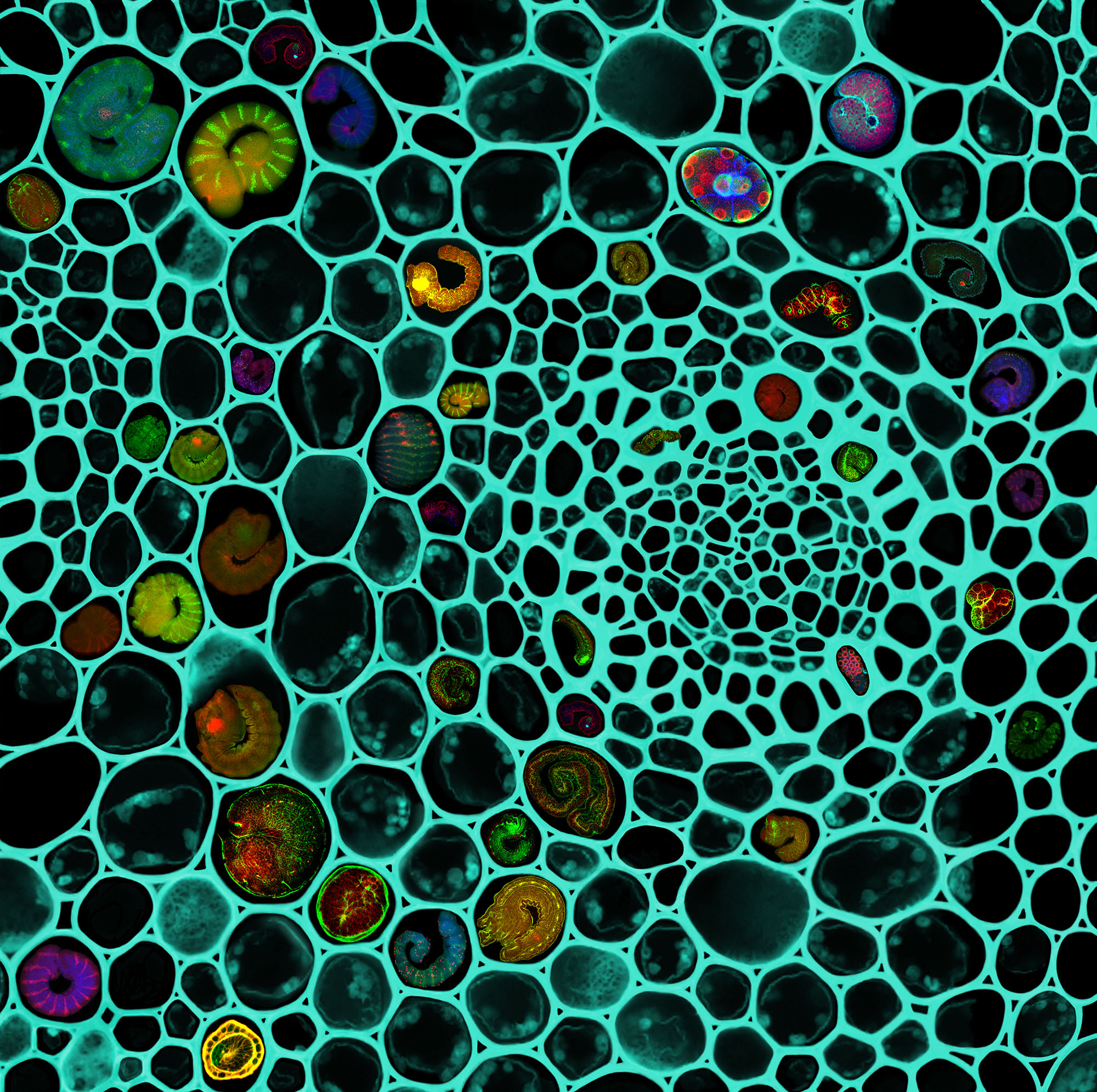 Stepping into Anna Rierola’s studio is like diving into a poetic and colourful representation of an aquatic underworld. On a wall hangs one of her pieces, entitled “Depths”. If you look at it from a certain angle, it could be taken for a nebula. Or even a continent as seen from a satellite. A trained eye, on closer inspection, will spot nanoparticles, a mouse embryo, cardiac muscle tissue, a retina, or even brain, kidney or liver tissues. When brought together into a grand artistic collage, this artwork breathes new life into scientific images generated in research labs across Europe.