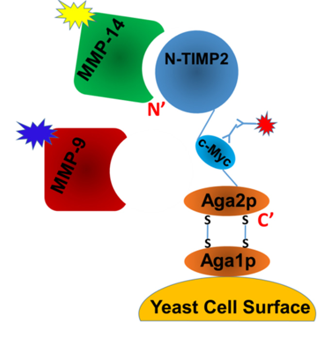 Matrix metalloproteinases (MMPs) function in numerous biological processes by degrading extracellular matrix components and proteolytically processing bioactive molecules. Deregulated MMP activities are implicated in various diseases, including cancer. Here, using a natural broad inhibitor of the MMP family as a scaffold for mutagenesis and yeast surface display technology, the authors engineer specific inhibitors for the membrane-bound MMP-14 and the secreted MMP-9. The study provides insights into the design of drugs targeting specific MMPs.
