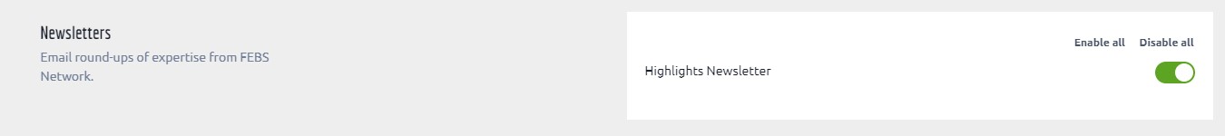 You have full control over the emails you receive from the FEBS Network on the email preferences page under Account Settings. Here you can turn on and off all the emails that you might receive as a registered user of the Network.