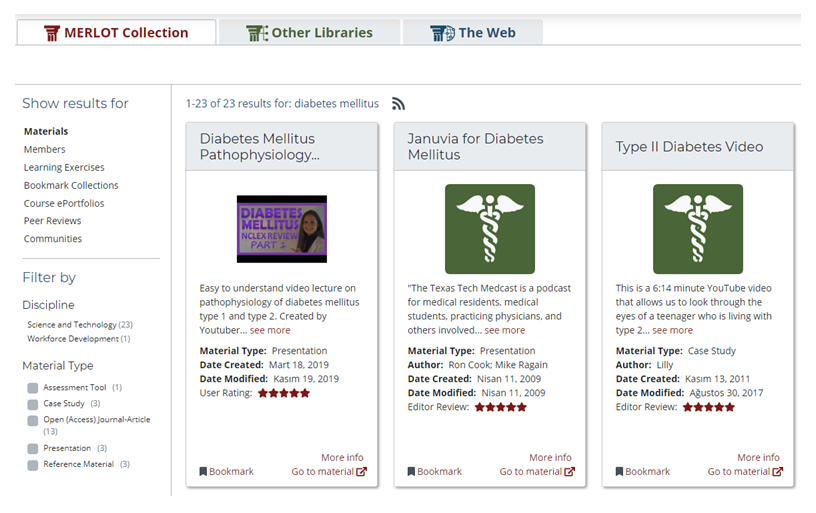When I searched "Diabetes Mellitus", MERLOT retrieved 23 results including a video, case studies, presentations, reference materials, scientific papers and even apps. You can filter these results based on material type, audience, having cost and/or creative commons license. When you are scanning though your results, you can immediately get some useful information such as a short description of the material, user ratings and creation/modification dates thanks to its nicely designed interface. You can access details of the material by clicking and learn more about the material including its author/creator, involved costs and creative commons license status. In both results and details page there is a " go to material" button which opens related web page in a separate tap.