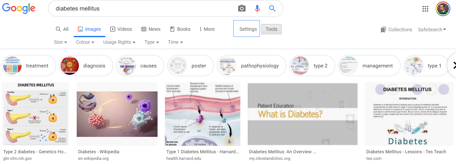 Google images much like google, scans relatively everything on the net via search algorithms. Therefore, it retrieves millions of results and it is difficult (but imperative) to refine it to obtain more relevant and specific images. Most common ways to do so are to combine multiple keywords and to use operators. That being said, the interface of google images provides some useful tools to refining as well. You can filter size to obtain high quality images, filter color to find images without a background (transparent) and filter type to refine animated images (GIF) as well as clip arts. If you need to find an image representing the insulin pathways and how they are altered in DM, you can search for: diabetes mellitus insulin pathway, and filter large transparent images. Now comes the tricky part: since google retrieves whatever it can find there is almost no way to make sure if the creator of the original content distributes it to be used freely. However, there are some measures you can take to prevent copyright infringement.