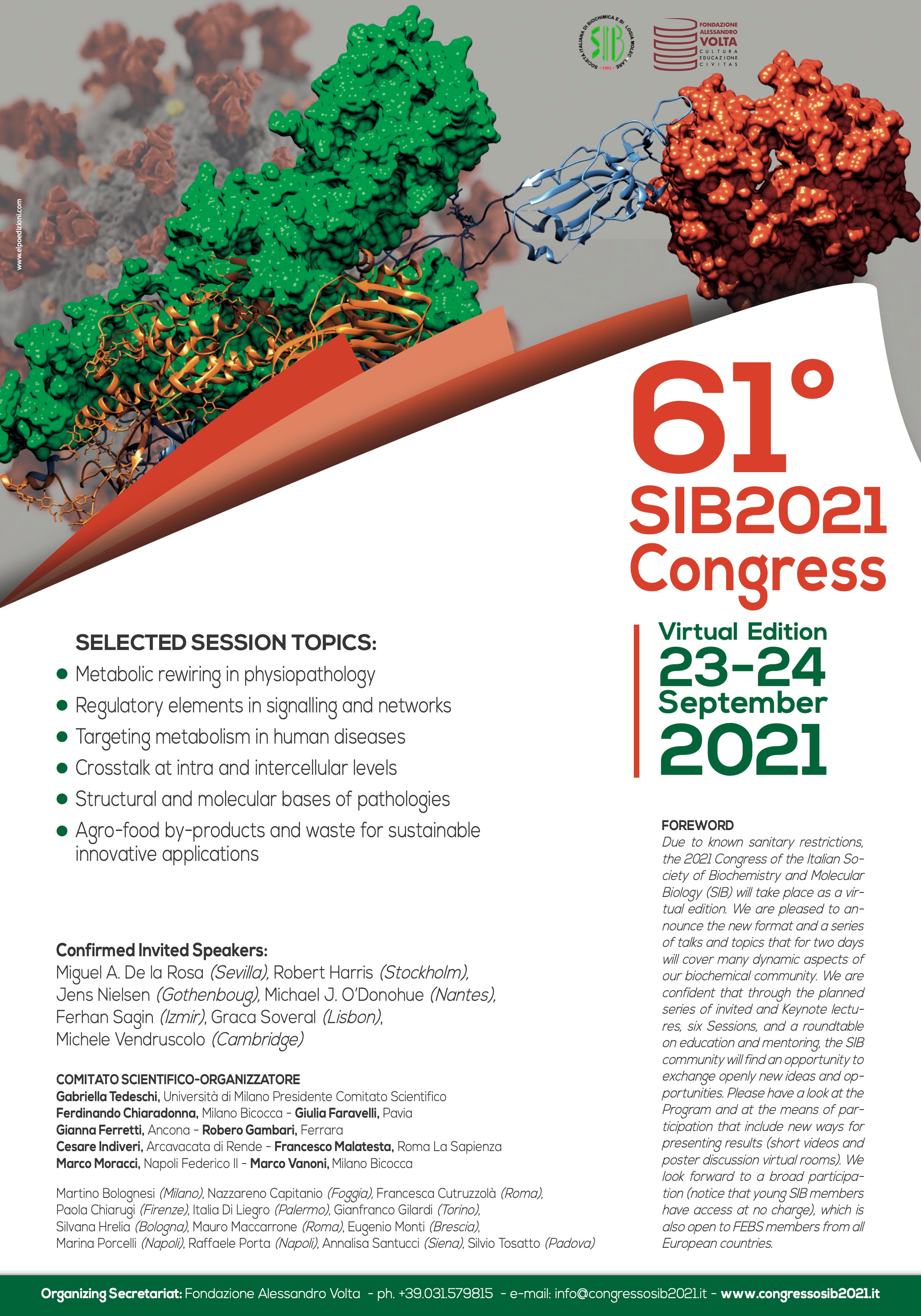 We are pleased to announce the new format and a series of talks and topics that for two days will cover many dynamic aspects of our biochemical community. We are confident that through the planned series of invited and Keynote lectures, six Sessions, and a roundtable on education and mentoring, the SIB community will find an opportunity to exchange openly new ideas and opportunities.