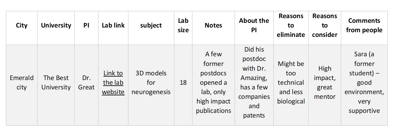 My Tip: Find someone who knows the lab and ask about things that are important to you. I reached out to a lot of alumni or people from neighboring labs who gave me valuable information that I would never have known otherwise. I included all in the table and started to apply to the most relevant labs.