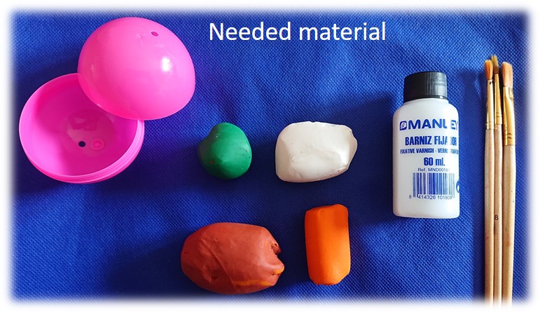 The wrapping of the virus is done by surrounding the two halves of the ball with modelling clay. With modelling clay of other colors, the spikes and the rest of the envelope proteins were formed. All of them were glued on the envelope. For the genetic material, the single-stranded RNA, a thin cylinder of modelling clay was used, to which balls of modelling clay were attached representing the nucleocapsid proteins. Finally, all the structures were varnished. When they were dry, the RNA was placed inside and the two halves were joined.