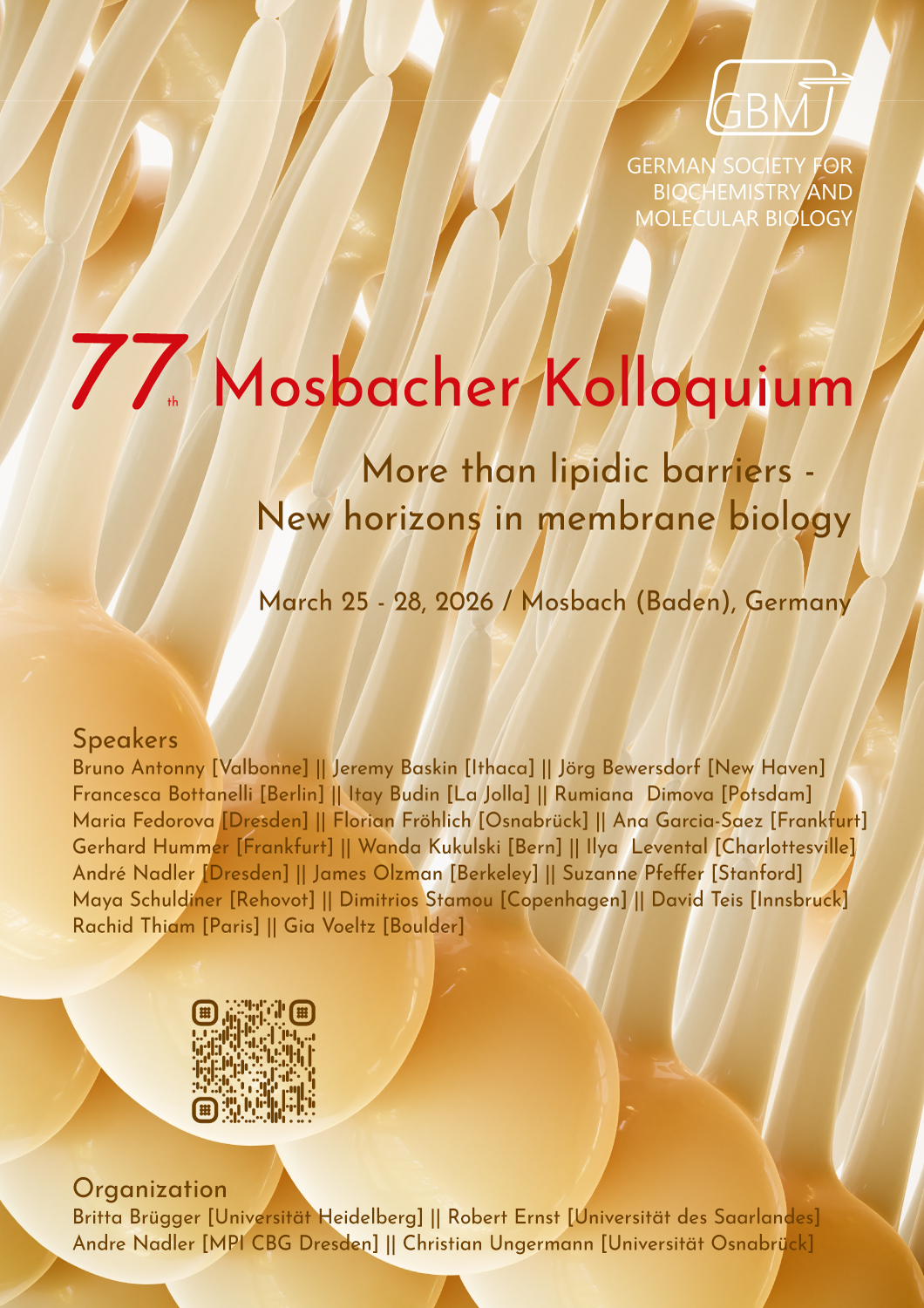 The Mosbach Colloquium 2026 has been designed to provide thorough coverage of key aspects of current membrane research and its importance for organismal physiology. The invited speakers represent the breadth of the field – from molecular analyses of membrane protein–lipid interactions, through membrane biophysics, to new techniques in lipid and protein analytics. The five sessions will begin with short introductions by the chairs to make the significance of the talks accessible to a broad audience. The program will feature presentations by established experts in the field as well as early career researchers.