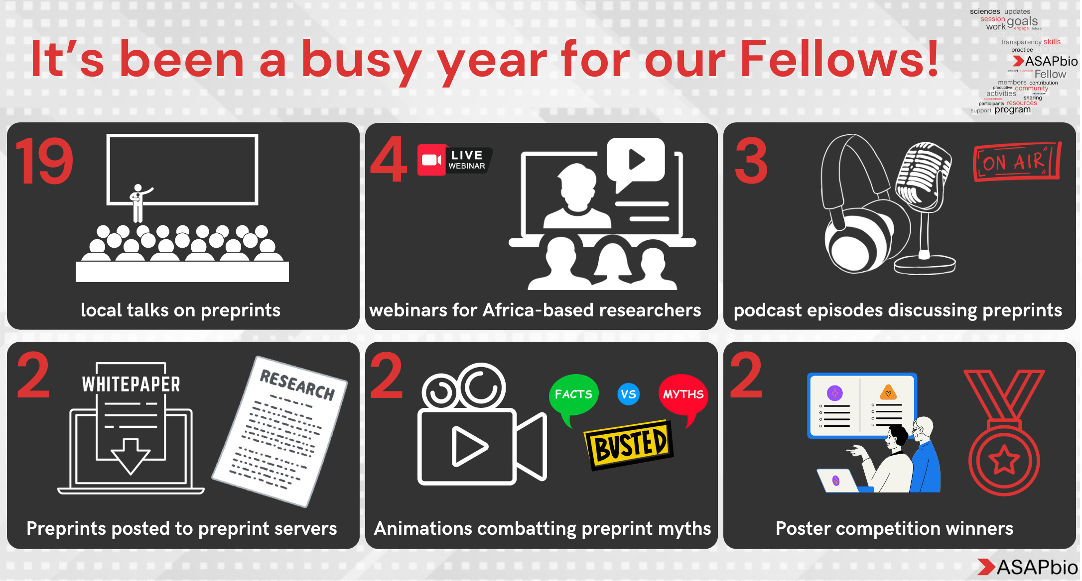 To work toward our mission to make communication in the life sciences more open and transparent, ASAPbio promotes the productive use of preprints. Many researchers do not receive training in scholarly publishing or communication. Additionally, many researchers have become familiarized with preprints by hearing about them from colleagues or by finding a preprint reporting the latest work in their field. These researcher-to-researcher interactions are invaluable to raise awareness about preprints. To foster more of these conversations, ASAPbio started a Fellows program in 2020.