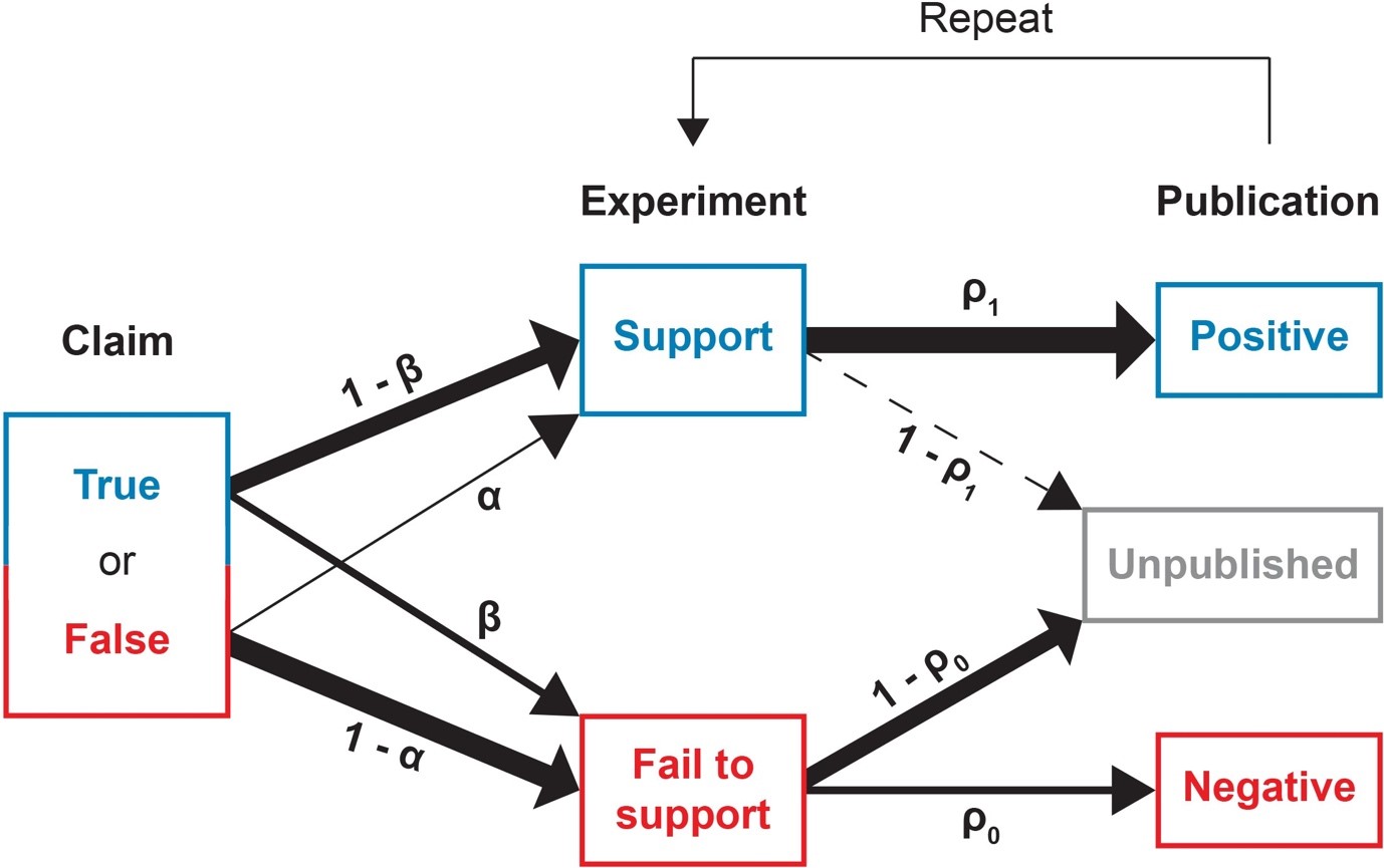 Figure 2. From Nissen, S. B., Magidson, T., Gross, K. and Bergstrom, C. T. (2016) Publication bias and the canonization of false facts. eLife, 5, e21451, doi:10.7554/eLife21451.001. Licensed under CC BY 4.0. True claims are correctly supported with probability 1−β while false claims are incorrectly supported with probability α. Positive results that support the claim are published with probability ρ1 whereas negative results that fail to support the claim are published with probability ρ0. This process then repeats, leading to evidence against a true claim disappearing from the literature over time if p0 is lower than p1.