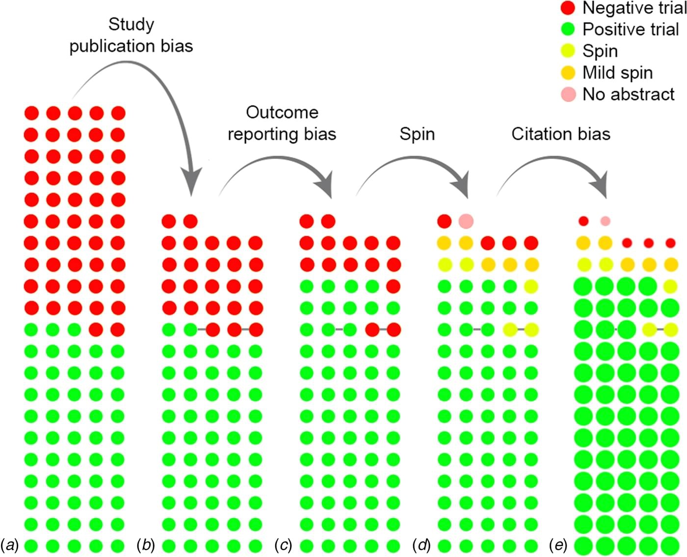 Consider this figure from a paper by de Vries et al. (2018). The dots in each bar correspond to a study; green for positive results and red for null results. The leftmost bar shows all the studies that were found on a clinical trial registry for testing an intervention for depression. In the rightmost bar, the size of the dot represents the number of citations received by that study. The difference between these bars is striking: we go from a situation where around 50% of studies show a positive effect to one where almost all studies do so. This study was only possible because trials in this field are registered, so we can see the unpublished studies: in most fields those studies are invisible, so our initial knowledge corresponds to the second left-hand bar, which already shows a rosy picture for the intervention. What happens next is the introduction of further bias, first by authors selecting from a range of measures only those that show positive outcomes, and second through spin, where the summary of a paper overhypes the findings. And if a study with null results somehow survives to make it into the literature, then it gets rapidly forgotten, as people find it uninteresting and fail to cite it.