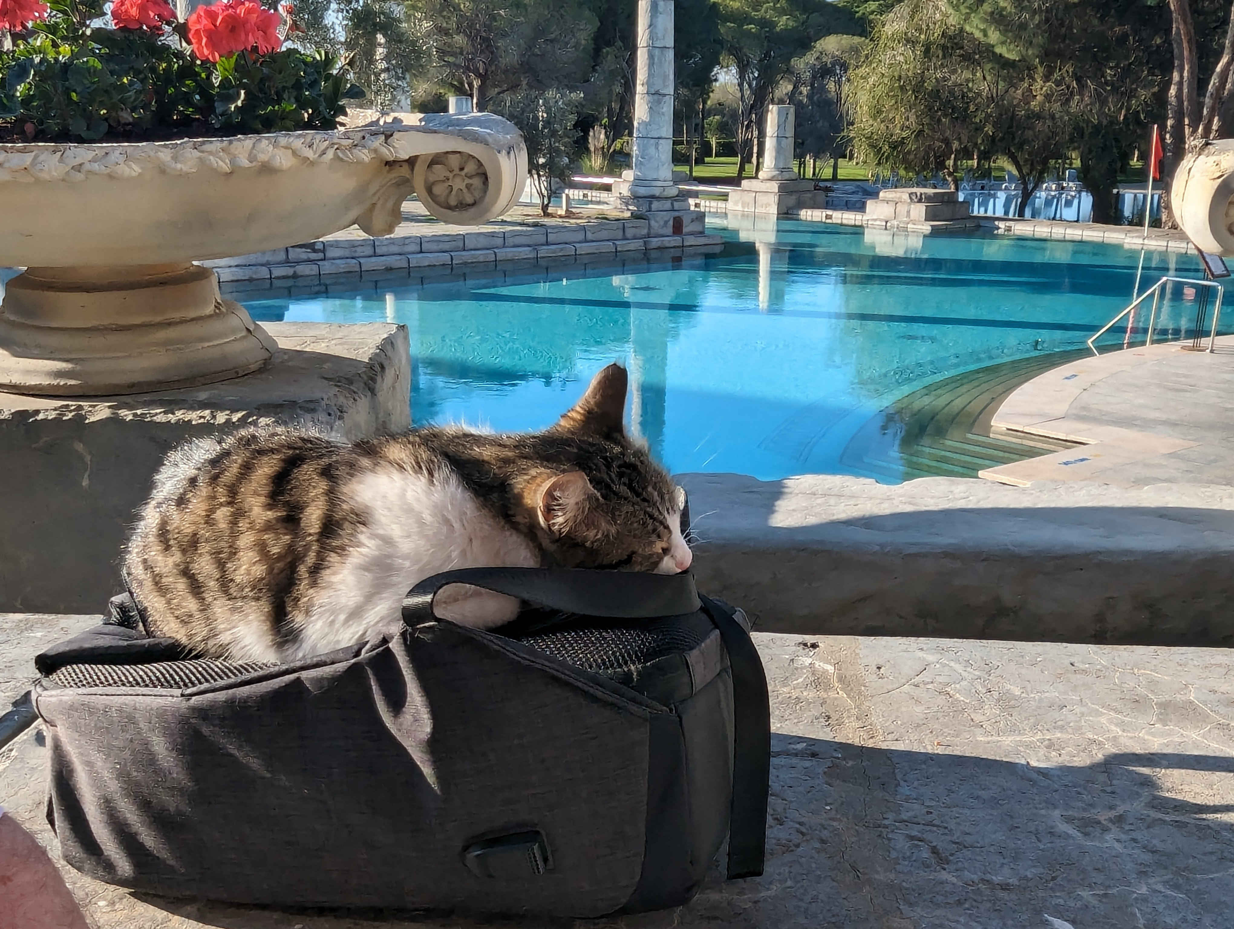 Breakfast on the terrace where our newest companion was caught sleeping on the job!