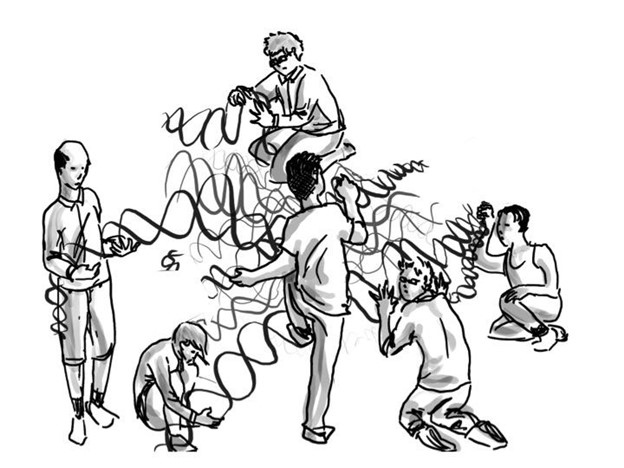 The collaboration enabled by Challenges and open science can be well illustrated by the parable of the blind men and the elephant. In this parable six blind men who have never encountered an elephant learn what an elephant is by being exposed to different parts of the elephant. While individually these men cannot fully grasp what an elephant is, together they have a chance to have an integrated concept of an elephant that goes beyond each man’s limited experience. Illustration: © Natasha Stolovitzky-Brunner.