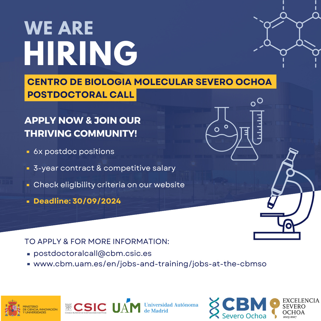 The Centro de Biología Molecular Severo Ochoa in Madrid, Spain is looking for candidates to apply for the CBM Postdoctoral Call, to further expand the international nature of our institute's community. We are looking to recruit six outstanding international early-career researchers (Postdoctoral Fellows) working on highly interdisciplinary topics related to our research areas.