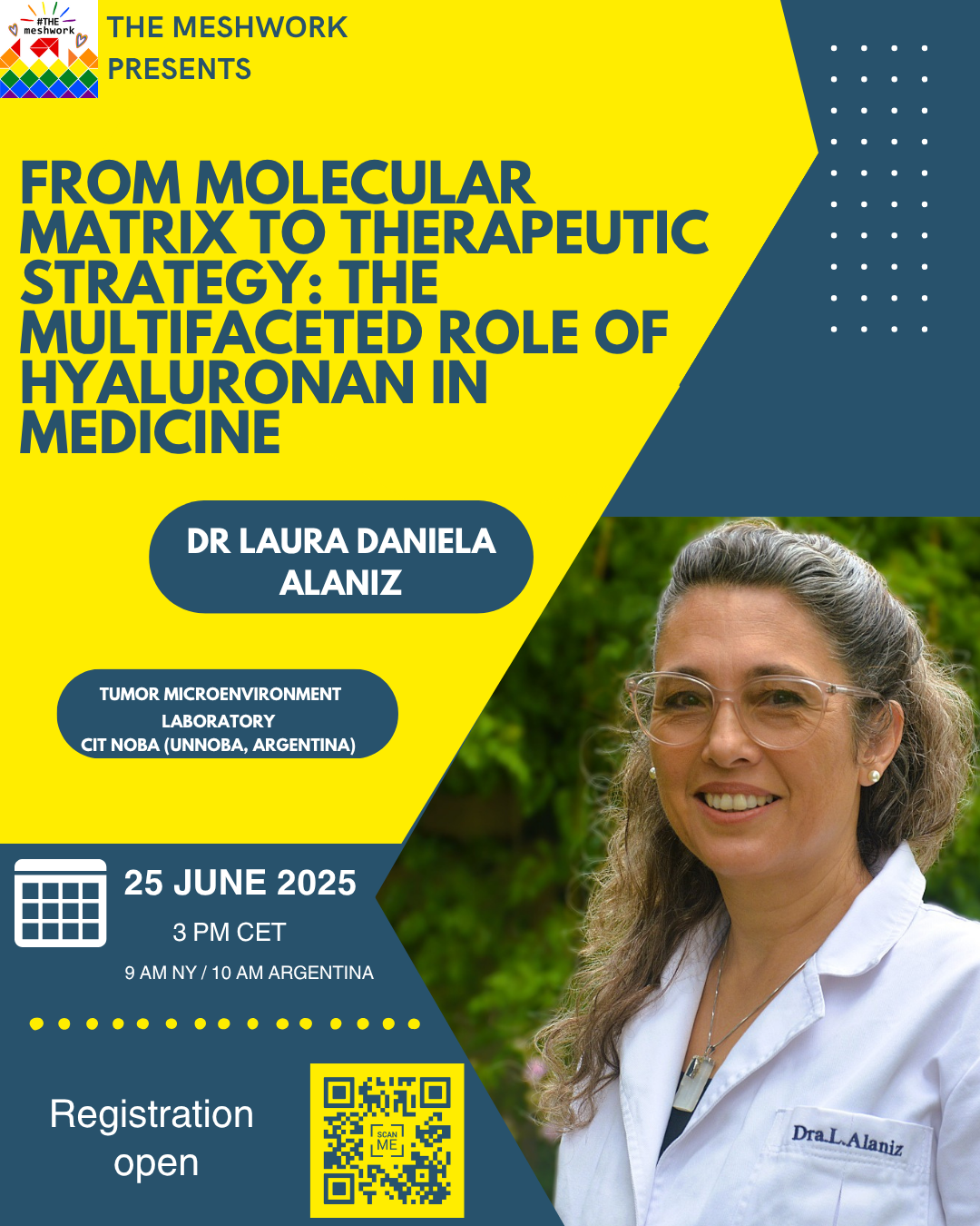 From its essential role in tissue structure to cutting-edge therapeutic applications, hyaluronan is far more than filler — it's a molecular powerhouse. Dr. Laura Alaniz (Group leader, CIT NOBA, UNNOBA, Argentina) will guide us through its biology, clinical relevance, and emerging potential across medicine.