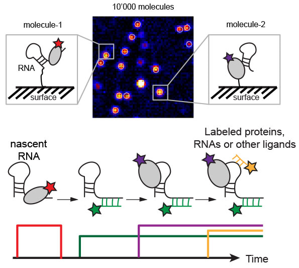 Figure 1: Multi-colour single-molecule fluorescence microscopy: thousands of single molecules can be visualized simultaneously. Each dot (top image) corresponds to an individual molecule that can be observed for minutes or hours. For example, we can detect how different ligands are binding and dissociating in real-time to a single immobilized target RNA molecule (bottom image).