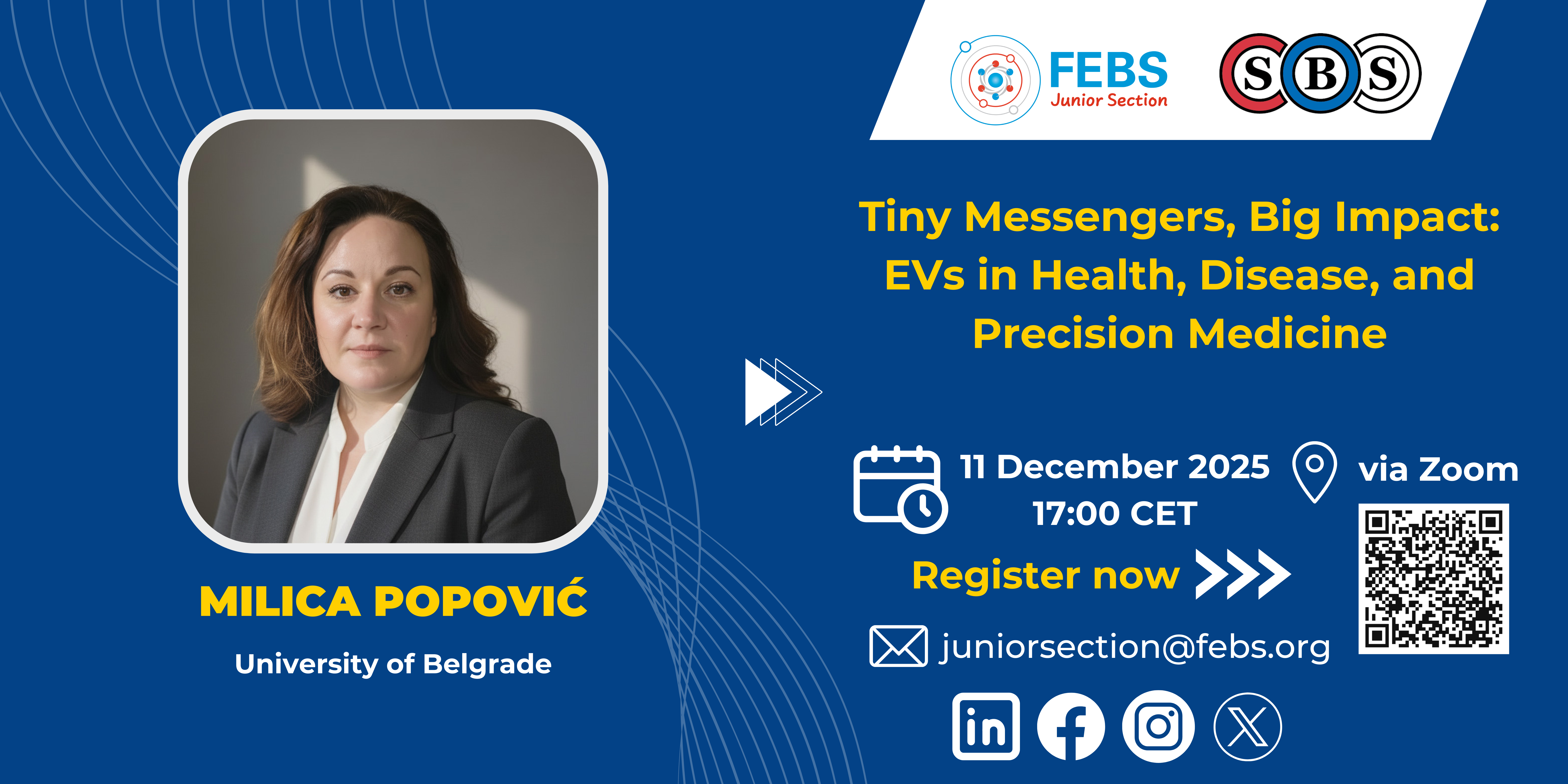 This talk is an activity from the FEBS Junior Section, an initiative set up by students and young researchers from some of the FEBS Constituent Societies. Each month members of the FEBS Junior Section organize an online event on either a research or a career topic. This talk was coordinated by the junior section of the Serbian Biochemical Society (SBS).