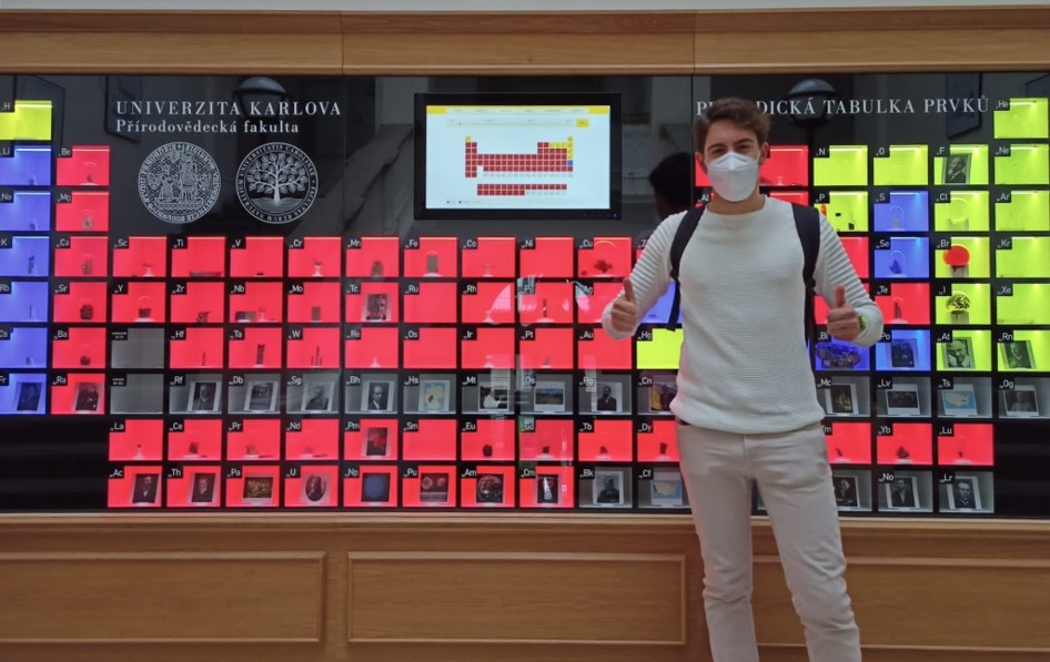 Photo: Alberto in front of an interactive periodic table at the Faculty of Chemistry of Charles University in Prague.