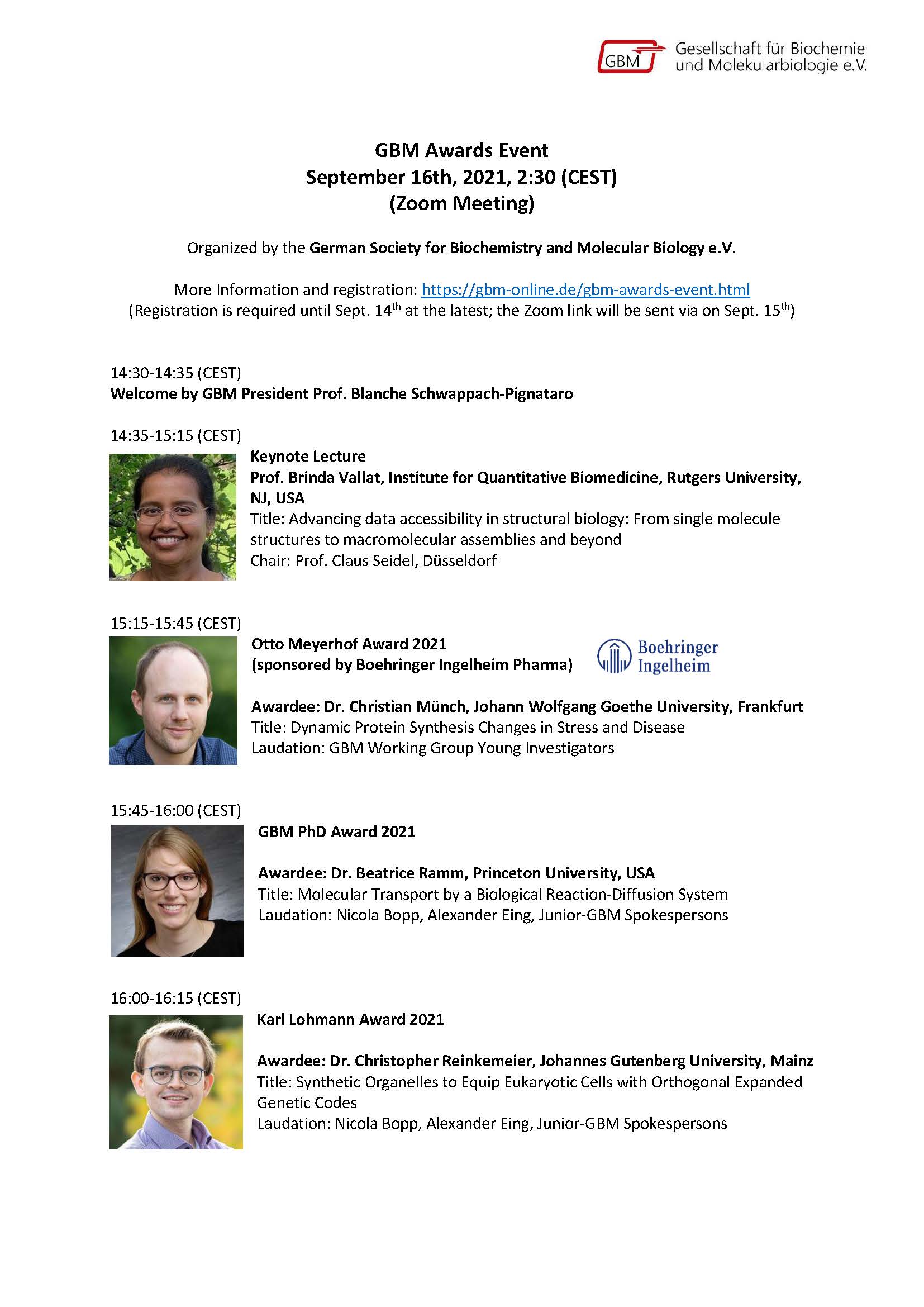 After a keynote lecture by Prof. Brinda Vallat, Rutgers University, USA, GBM will award three outstanding young researchers with the Otto-Meyerhof-Price, the GBM-PhD-Price and the Karl-Lohmann-Price. All awardees will present on their work with a lecture.