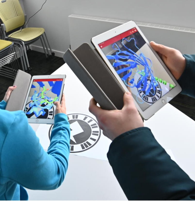 Previously the use of 3D printed tactile objects has helped aid students understanding and promote a greater depth of engagement with the topic (see article link in further reading). After initially investigating the use of virtual reality (VR) headsets to display 3D models in a virtual space, we found that this can be a solitary experience unless the view of the individual wearing the headset is cast to a secondary monitor. As a result, we looked for alternative technologies to bring this topic to life.