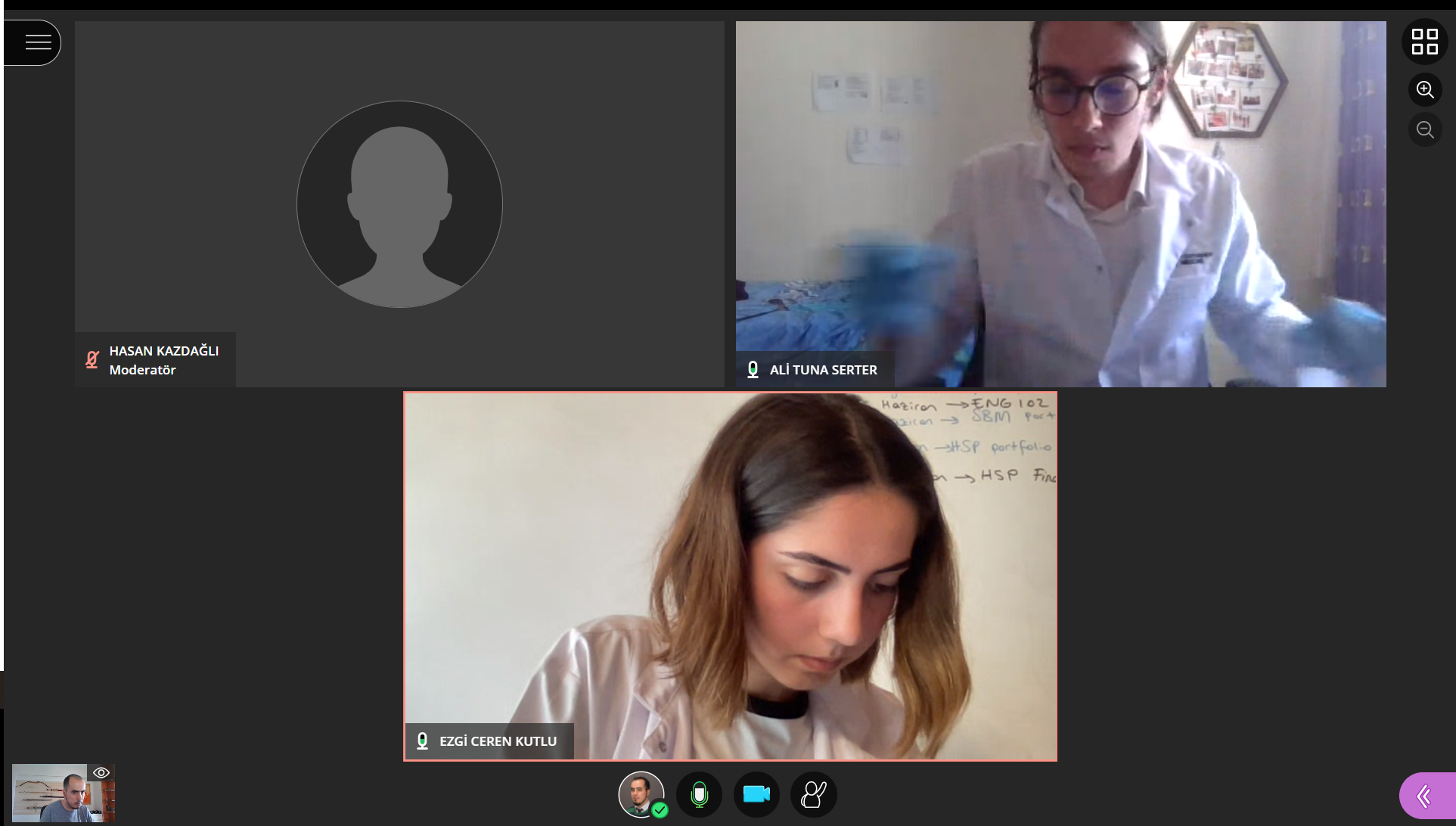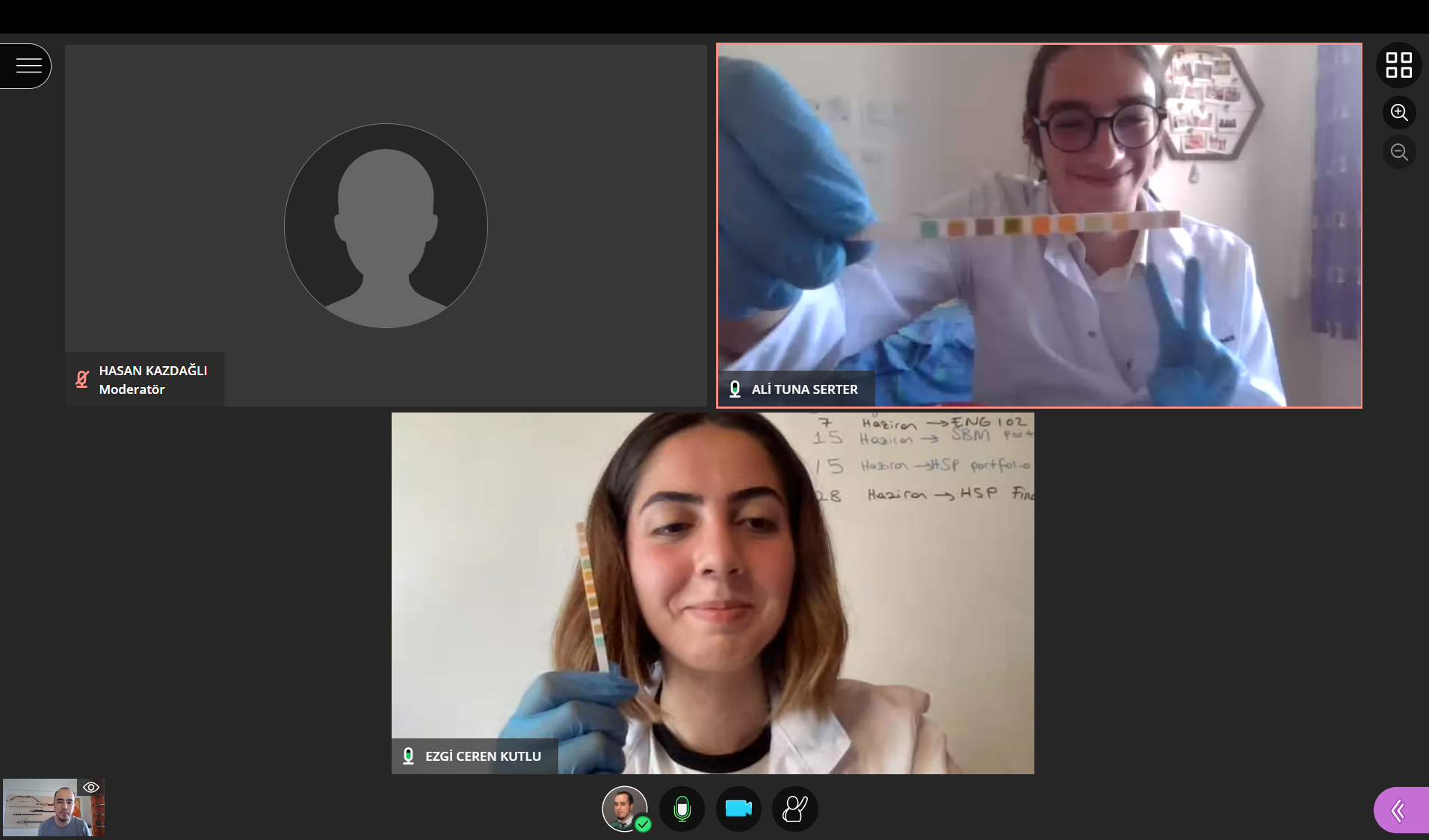We, then moved on collecting volunteers for a practical distance learning session. Unfortunately, we only had two volunteers (from 63 total learners). On the bright side, those two were not only cooperative but also supportive and I can say that they have become members of the the team conducting this research in addition to being a very small sized sample group. Our teaching assistant Hasan Kazdağlı (PhD), has collected their addresses and made sure that urine containers, 10 parameter dipsticks, a printed out color chart, as well as gloves were delivered to them before the time of the practical.  I also shared the guide (protocol) with them which contained a risk assessment section. They were instructed to cover the surface they are going to work on with stretch film, put their gloves and lab coats on. I also informed them regarding this tiny educational research project and received their consent on the matter. They were kind enough to let me use these screenshots from the practical as well:
