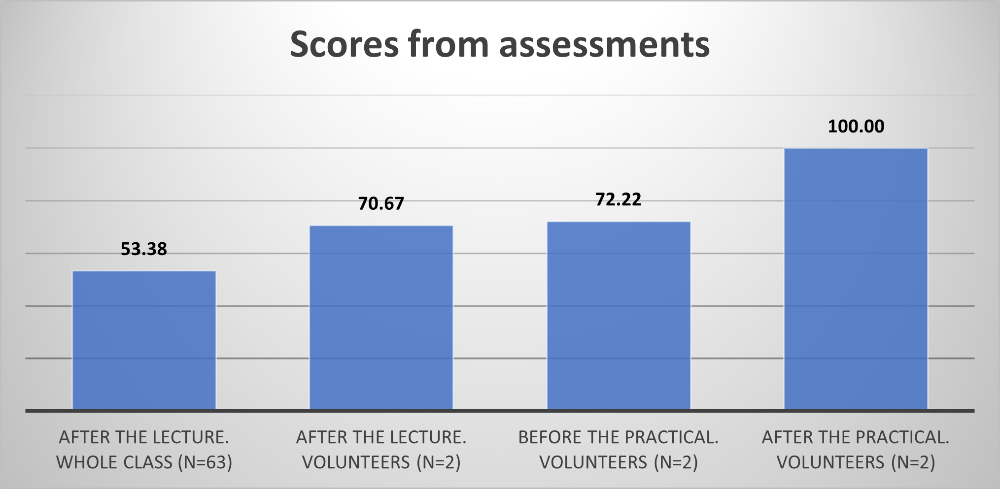 When I looked at the data obtained from the exams, I realized that the average score of volunteers in the midterm was already higher than the class average. I think this is some kind of a selection bias as becoming a volunteer might suggest that they were more enthusiastic about the subject to begin with. Even though it was slightly increased in the pre-test, as expected the real change came after the practical as both learners scored perfect 100s.