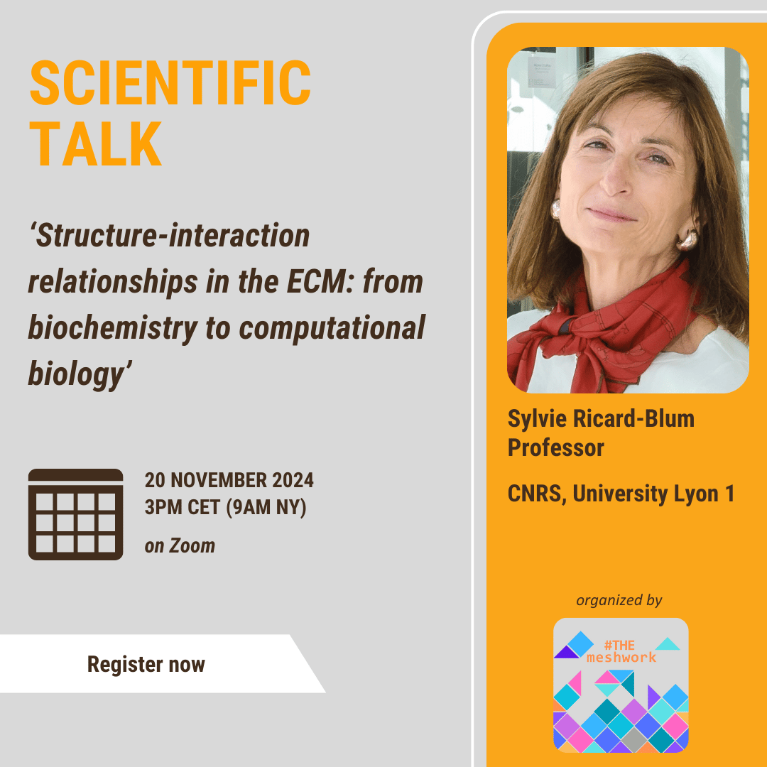 It is our great pleasure to invite you to another online event organized by The Meshwork. This time Prof. Sylvie Ricard-Blum will share her journey from biochemistry to computational biology, provide insights and present the new version of MatrixDB, an online database that helps uncover ECM protein interactions. Prof. Cathy Merry from Nottingham University will act as chair.