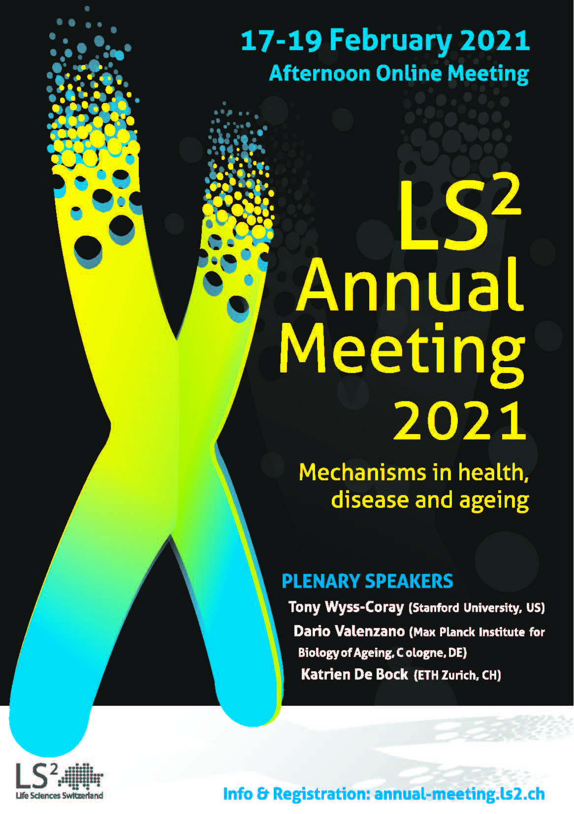 It is our pleasure to invite you to the Annual e-Meeting 2021 of Life Sciences Switzerland (LS2) on the topic "Mechanisms in Health, Disease and Ageing", held during three afternoons on February 17, 18 and 19, 2021 in an ONLINE format.