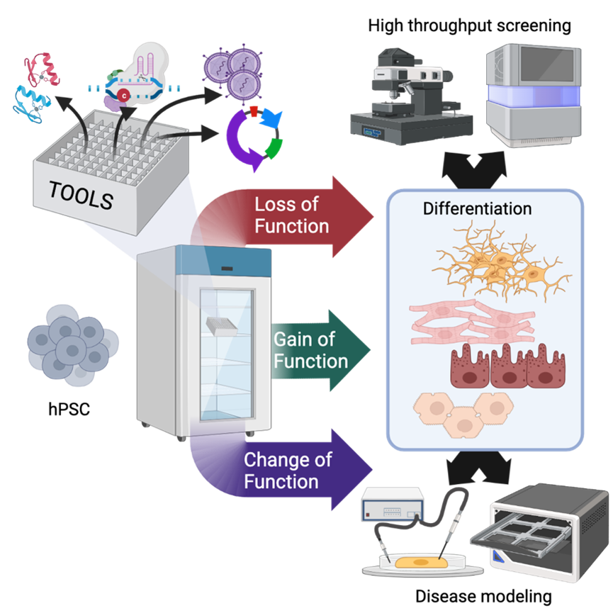 Combining these two approaches has some nuances, for instance hiPSCs are very sensitive to DNA damage, but can be done quite effectively allowing all kinds of modifications in hiPSCs, such as the correction (or introduction) of gene mutations, the expression of fluorescent reporters, or even the creation of complex synthetic circuits to direct hiPSC differentiation into specific lineages.
