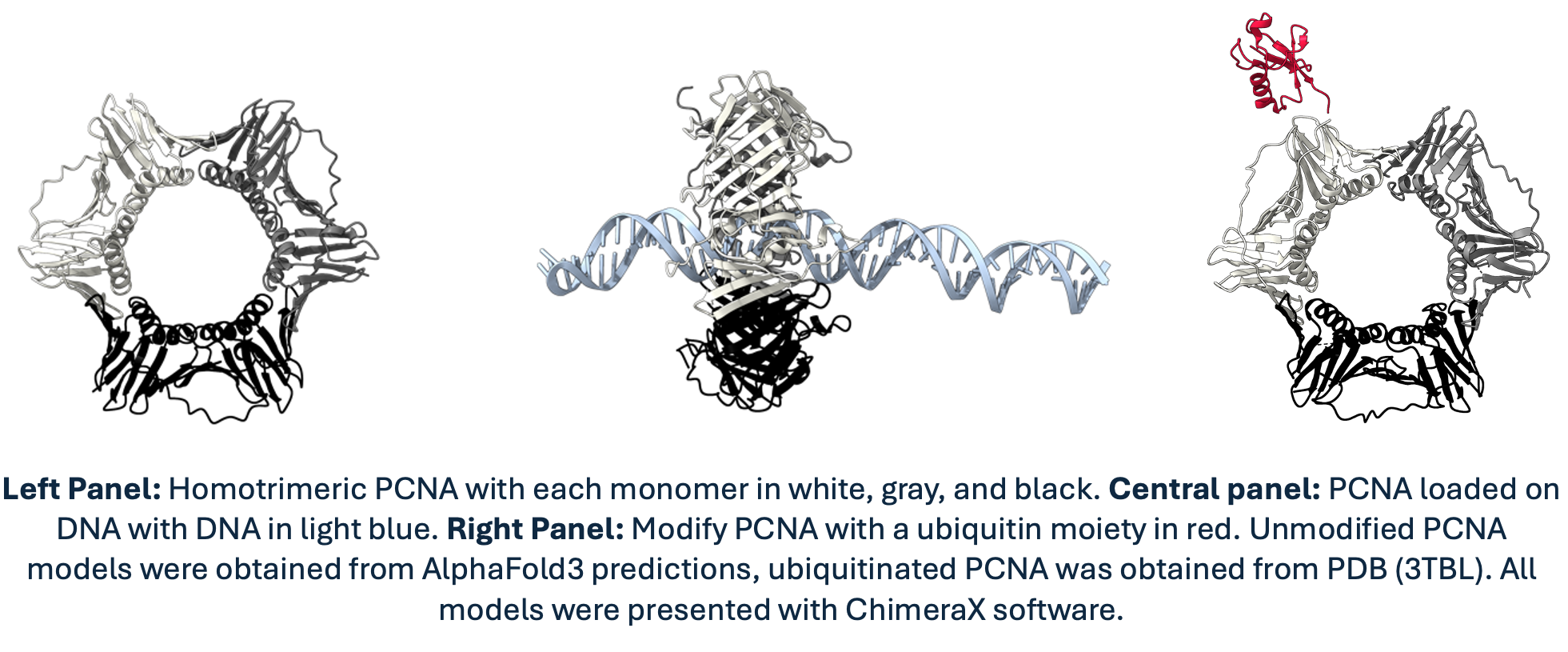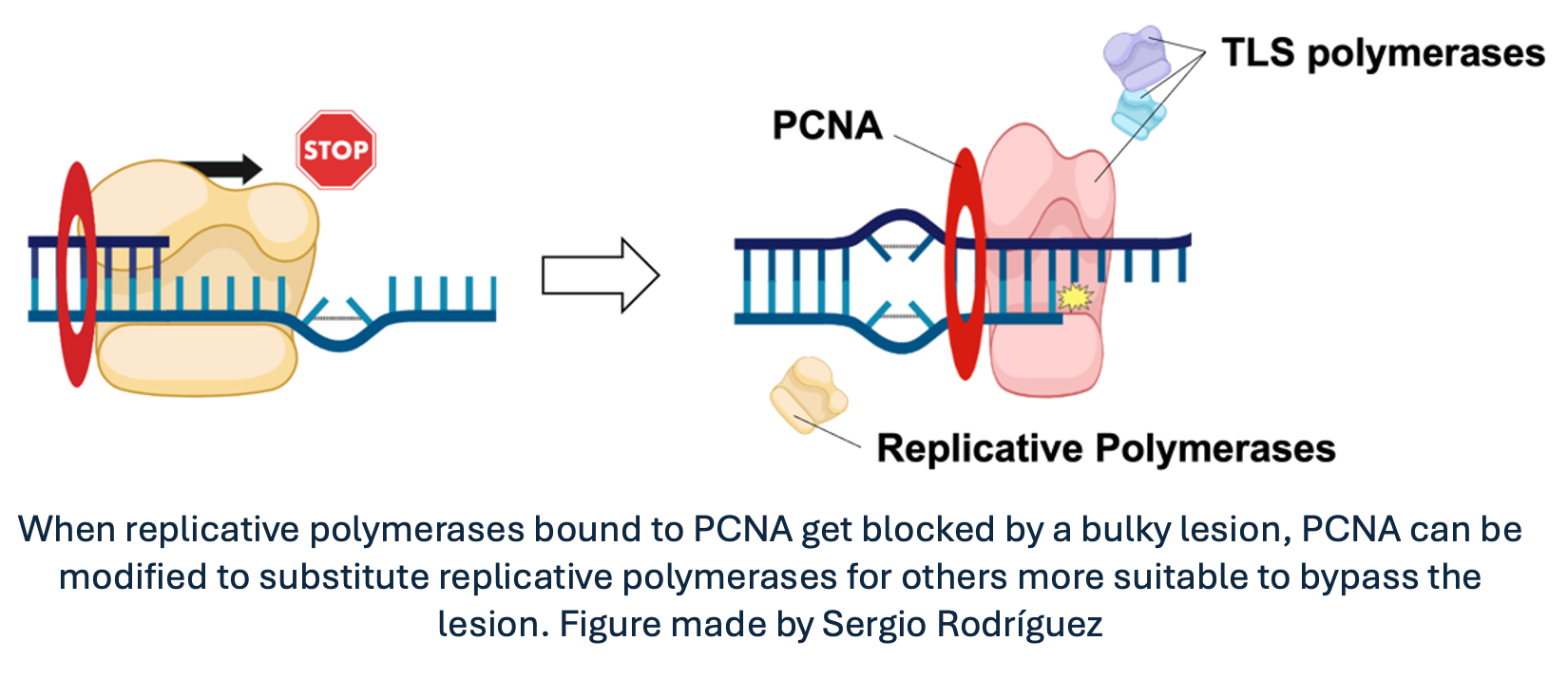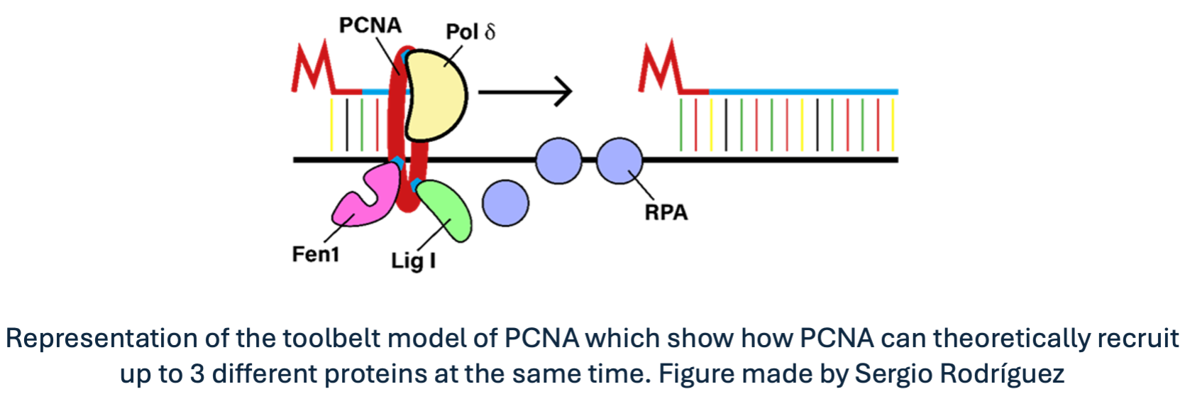 For instance, when encountering DNA lesions, replicative DNA polymerases bound to PCNA get stalled, resulting in potentially harmful effects on cell viability. To avoid this outcome, PCNA can be modified by other proteins to change the affinity for the replicative polymerase. Hence, replicative polymerases are substituted by other types of polymerases that are structurally more suitable for bypassing the lesion and continuing replication coordinately. Furthermore, since PCNA is a homotrimeric protein, it could theoretically bind three different proteins at the same time, acting as a moving toolbelt that places the required tool where and when is required. Awesome, right?