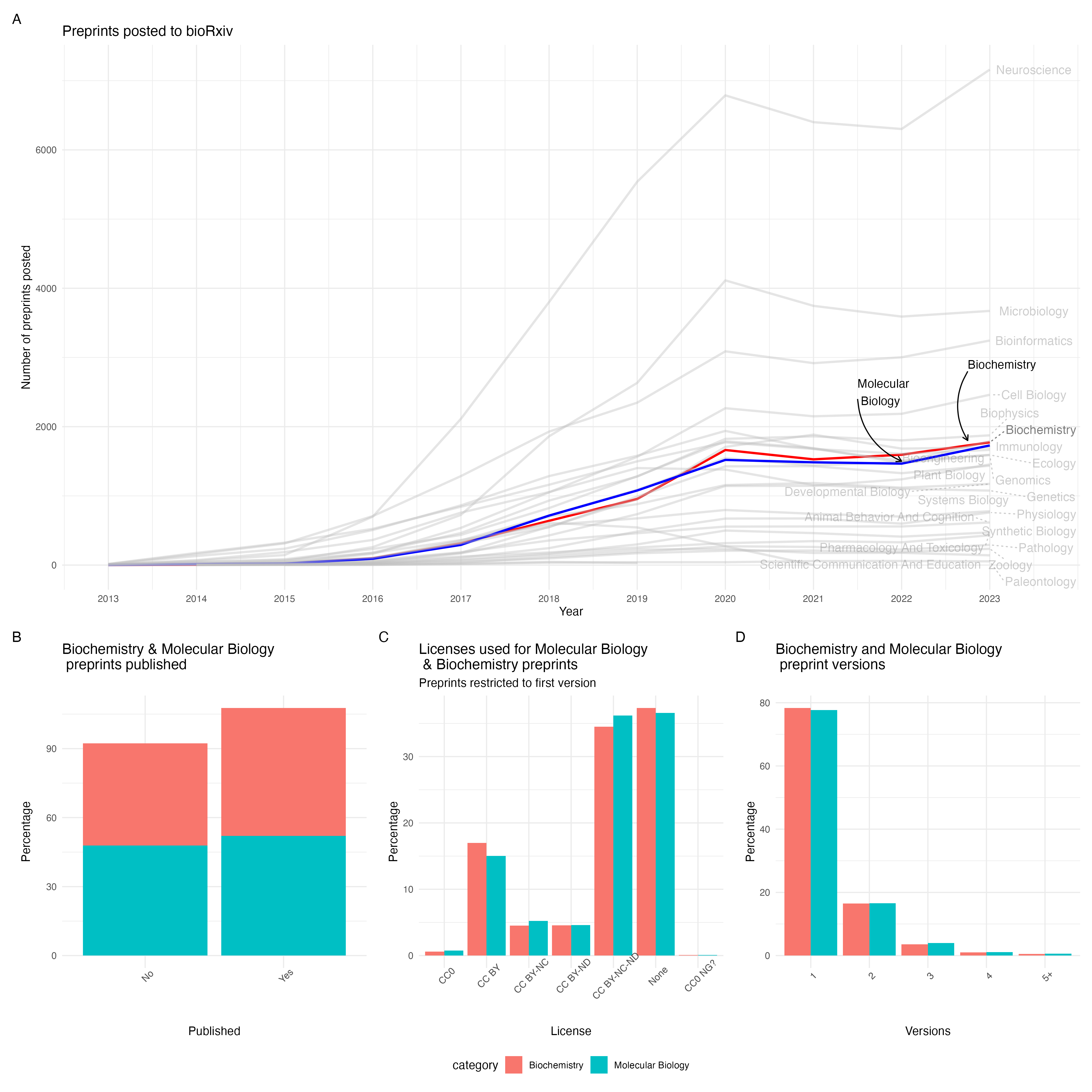 Approximately ~70% of bioRxiv preprints are eventually published, with our data showing that at least 55% of Biochemistry and 52% of Molecular Biology preprints have been published in a journal by the end of 2023 (though this number is likely to be higher due to issues linking preprints to the published version) (Fig 2B). In the wider context of open science, the license choice made by authors determines how “open” a preprint is. Both Biochemistry and Molecular Biology preprints are largely posted with restrictive license choices, with only 17% of Biochemistry and 15% of Molecular Biology preprints having an open, CC-BY license (Fig 2C). Across bioRxiv, most preprints are posted as single versions, a trend that is also found for Biochemistry and Molecular Biology preprints (Fig 2D). By not updating preprints, authors are losing out on a major benefit of iteratively updating their work.