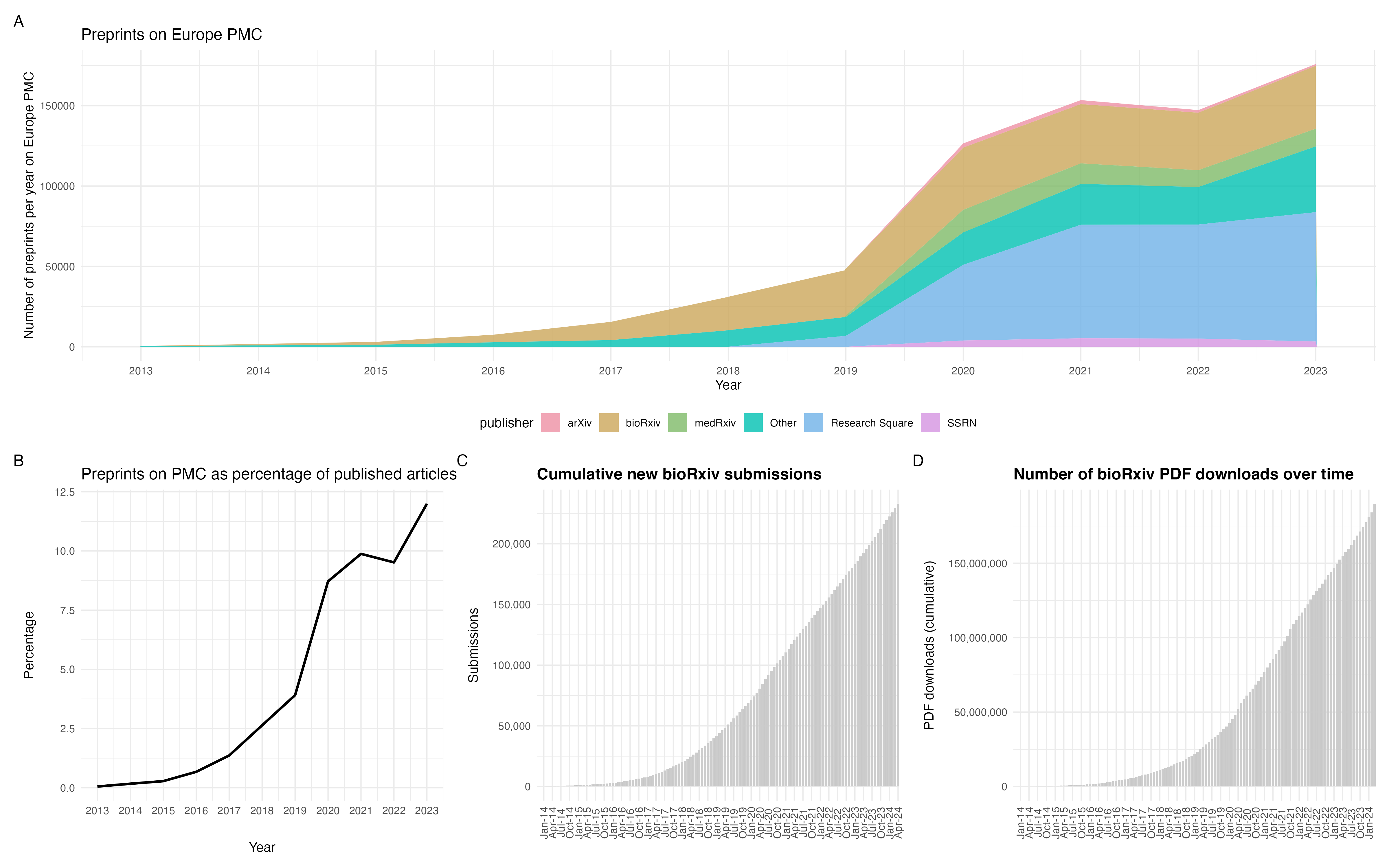 The origins of preprinting date back to the 1960s with the biology-focussed NIH information exchange groups (IEGs). Indeed some of these initial IEGs were focussed on Biochemistry and Molecular Biology, placing these fields at the very earliest stages of preprinting within the life sciences. However, this initiative faced opposition from publishers and scientific societies who effectively ended the IEGs by 1969. In 1991, arXiv launched and the physics community rapidly adopted preprinting. It was not until the launch of bioRxiv in 2013 that biology began to accept preprints. More recently, some funders such as the Chan Zuckerberg Initiative and Bill & Melinda Gates Foundation have begun to mandate preprints for their grantees. We’ve also witnessed government declarations that support a not-for-profit, no cost to authors or readers system of academic publishing; effectively, this is a system that has preprints at its core. In 2023, there were over 750,000 life science preprints (Fig 1A), representing approximately 12% of the literature (Fig 1B). Over 220,000 of these preprints are hosted on bioRxiv (Fig 1C). Cumulatively, bioRxiv preprints have been downloaded over 150 million times since 2013 (Fig 1D).