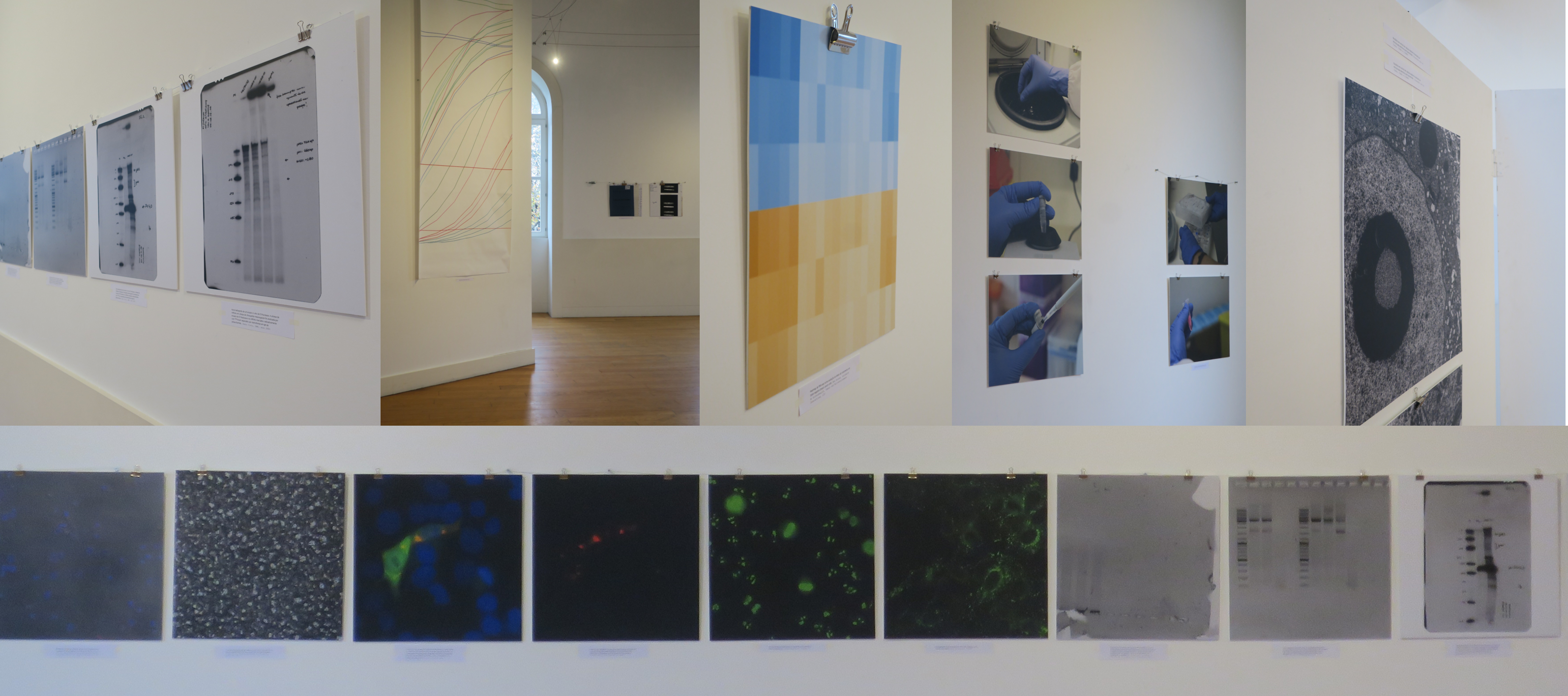 The exhibition focused on the visual culture of RNA research, including images such as autoradiographs, electrophoresis gels, RNA fluorescence in situ hybridizations (RNA-FISH), electron micrographs, heatmaps of RNA-seq results, immunofluorescence micrographs and RT-qPCR plots. Composed of a series of large format images of those visual traces that populate research labs, it was structured into three sections: