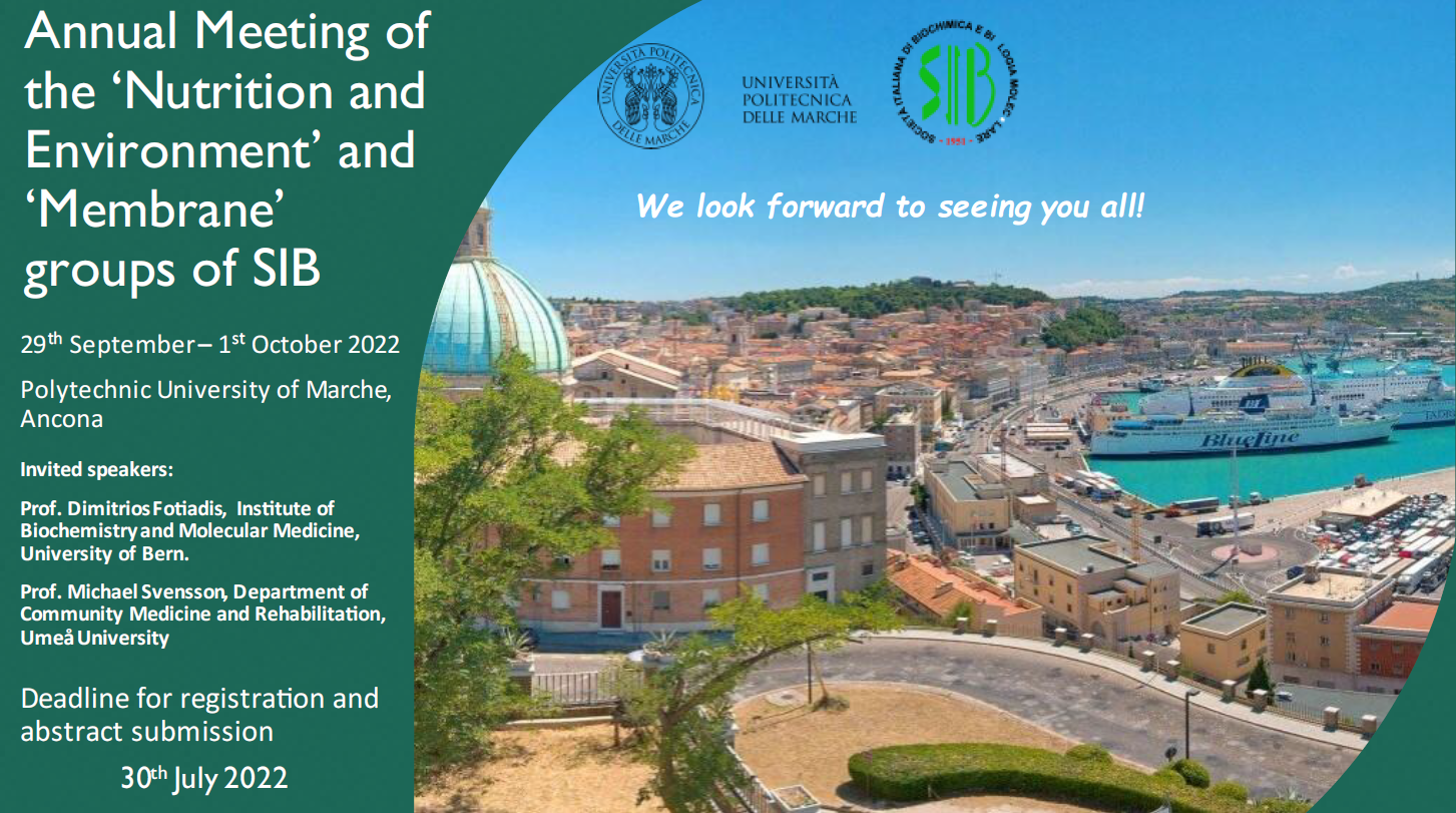 we are glad to invite you to attend the Joint Workshop SIB organized on behalf of the Groups “Nutrition and Environment” and “Membrane” belonging to the SIB (Società Italiana di Biochimica e Biologia Molecolare). The workshop will be held at the Polytechnic University of Marche, from 29th September to 1st October 2022.