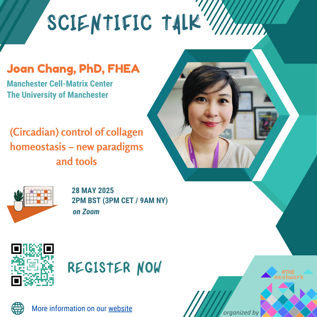 The monthly online seminars by The Meshwork continue. This time we are joined by Dr Joan Chang (Manchester Cell-Matrix Centre, University of Manchester)