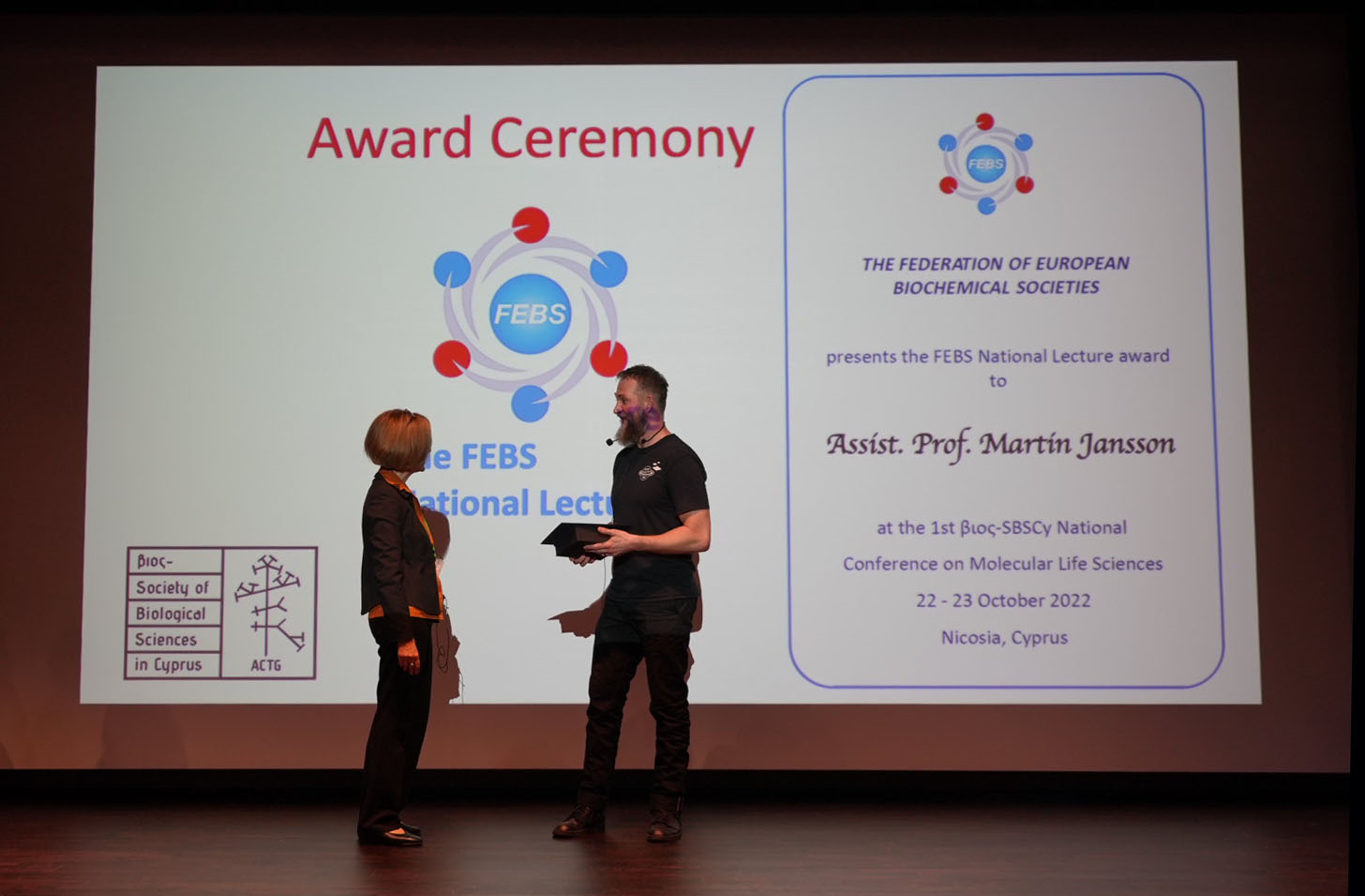 Since February 2021, and despite the Covid 19 pandemic, the βιος-SBSCy has offered a rich scientific program to its membership, in English, by establishing, via on-line platforms, a regular research Seminar Series with international invited speakers and a regular Coffee Series with short scientific talks, followed by discussion among participants. In October 2022, we organized the “1st βιος-SBSCy National Conference on Molecular Life Sciences” at the University of Cyprus. This was a two-day in-person scientific conference with talks from international speakers, short talks from young researchers, and a poster session. The conference highlight was the FEBS National Lecture, the first ever in Cyprus, delivered at the Ceremonial Hall of the old campus of the University of Cyprus by Dr Martin Jansson, Assistant Professor at the Biotech Research and Innovation Centre (BRIC) of the University of Copenhagen, and entitled: “Tuning the ribosome in health and disease”.