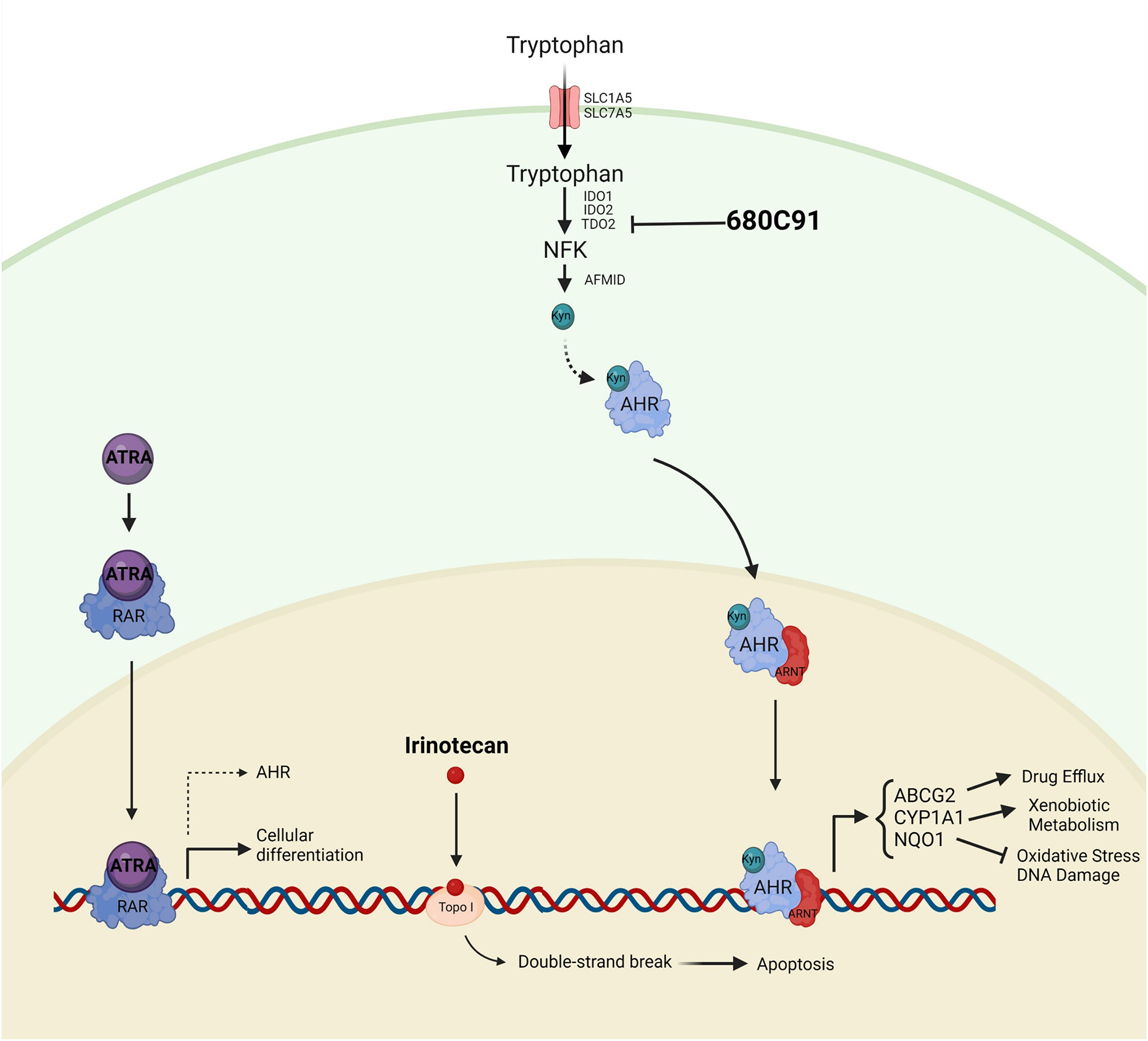 In their new work, Lopes Santos et al. have investigated the role of the Kynurenine-AHR (aryl hydrocarbon receptor) pathway in neuroblastoma cells, with the hope of being able to identify a chink in the armour of the cancer’s defences. They found that AHR and its target genes (such as ABCG2, which encodes a transporter involved in drug efflux) were upregulated upon drug treatment of neuroblastoma cells. AHR is a transcription factor that, upon binding to its ligand Kynurenine translocates to the nucleus where it interacts with ARNT1 to form a transcriptionally active dimer. Importantly, Kynurenine is a product of the Trp pathway via IDO1/2 and TDO2. The authors found that neuroblastoma cells are sensitive to TDO2 inhibition, and that combining TDO2 inhibition with existing chemotherapeutic agents (ATRA or irinotecan) showed synergistic anticancer effects, revealing potential vulnerabilities. Although neuroblastoma is a highly genetically heterogeneous disease, tailoring treatment to patients with active Kynurenine-AHR pathways could improve outcomes for this high-risk subgroup of patients.