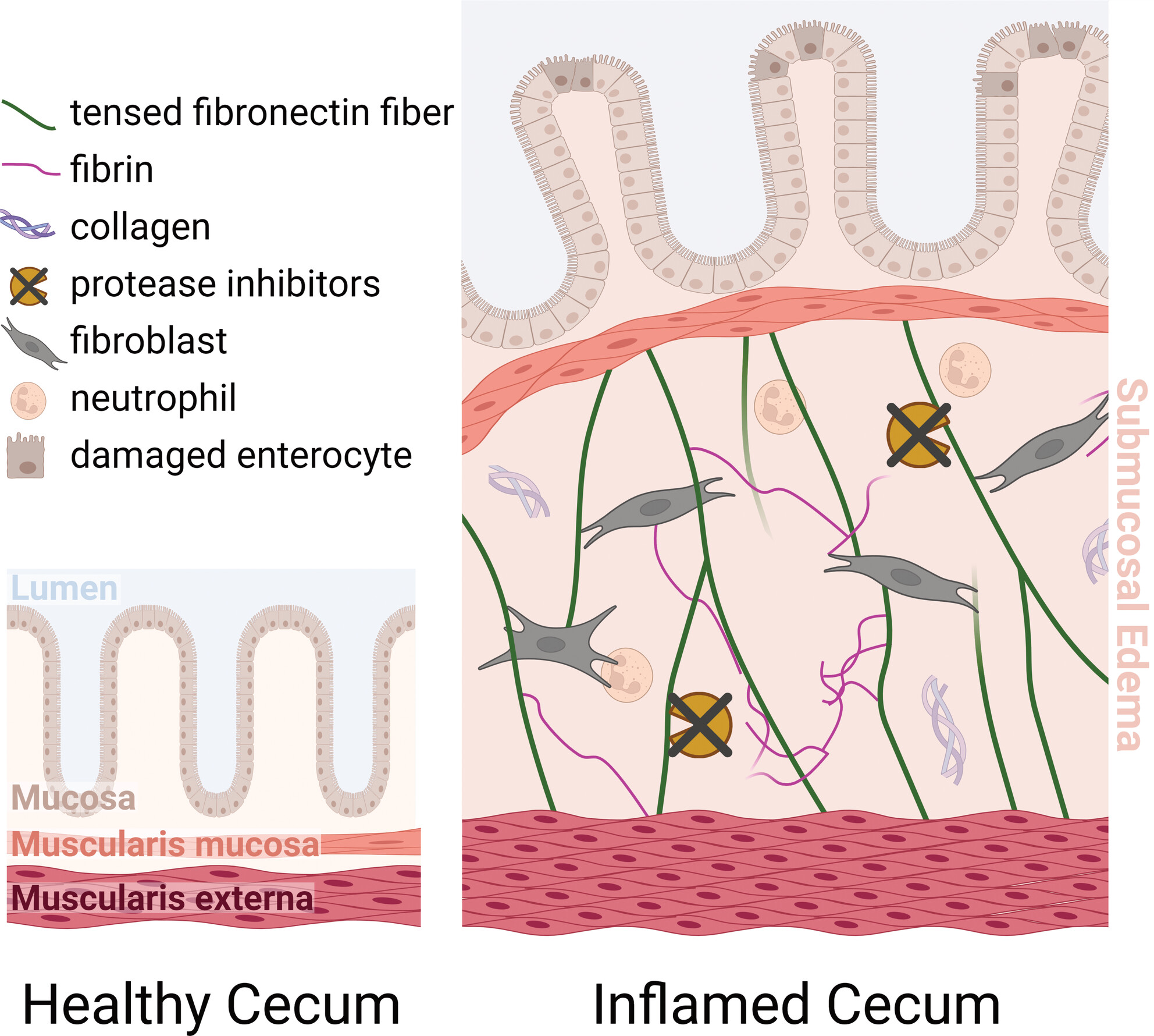 Laser capture microdissection and advanced proteomics allowed the team to identify candidate proteins involved in the regulation of intestinal remodelling. They combined this with (immuno)histochemistry microscopy and the low-tension fibronectin probe, FnBPA5, to show that fibronectin, a key component of the extracellular matrix, is tensed within the edematous regions, despite the presence of proteases that could and probably should cleave it. The proteomics data also highlighted distinct mechanisms of protease inhibition to protect these stretched fibronectin fibres from degradation. They hypothesised that it was this tension in fibronectin fibres that is crucial for preserving tissue structure, effectively serving as “bungee” cords keeping the inner and outer muscle layers connected even when massive fluid influx separates them. The authors’ multidisciplinary approach is a real step forward in understanding the delicate balance between pathogen defence and tissue preservation, hopefully leading to valuable diagnostic markers for the progression of intestinal disease.