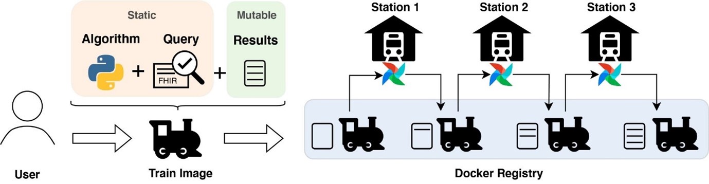 The basic idea of the PHT is that the analysis algorithms (wrapped in a ‘train’) travel between multiple hospitals (so-called ‘train-stations’), which host the input data and computation resources inside their own secure facilities. Trains are implemented as light-weight containers enabling the rapid deployment of complex software pipelines by removing the need to install additional software that might be required to perform the analysis. Such pipelines can range from heavy workloads such as image analysis to bioinformatics pipelines (e.g., nf-core) on high-volume data to secure count queries or basic statistics over multiple sites. Trains travel iteratively from one station to another updating the results securely, which is also known as online learning.
