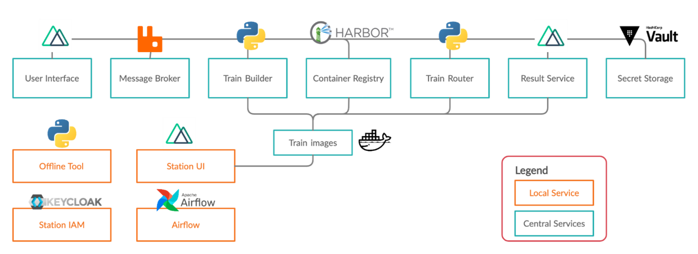 Central service components are used for train submission and train distribution, while local services at hospitals permit the secure execution of trains and reliable data access. Several well-established open-source services are combined with self-developed services. The icons of the services represent the programming language or the software used. Additional information about Tübingen's development can be found on our homepage.