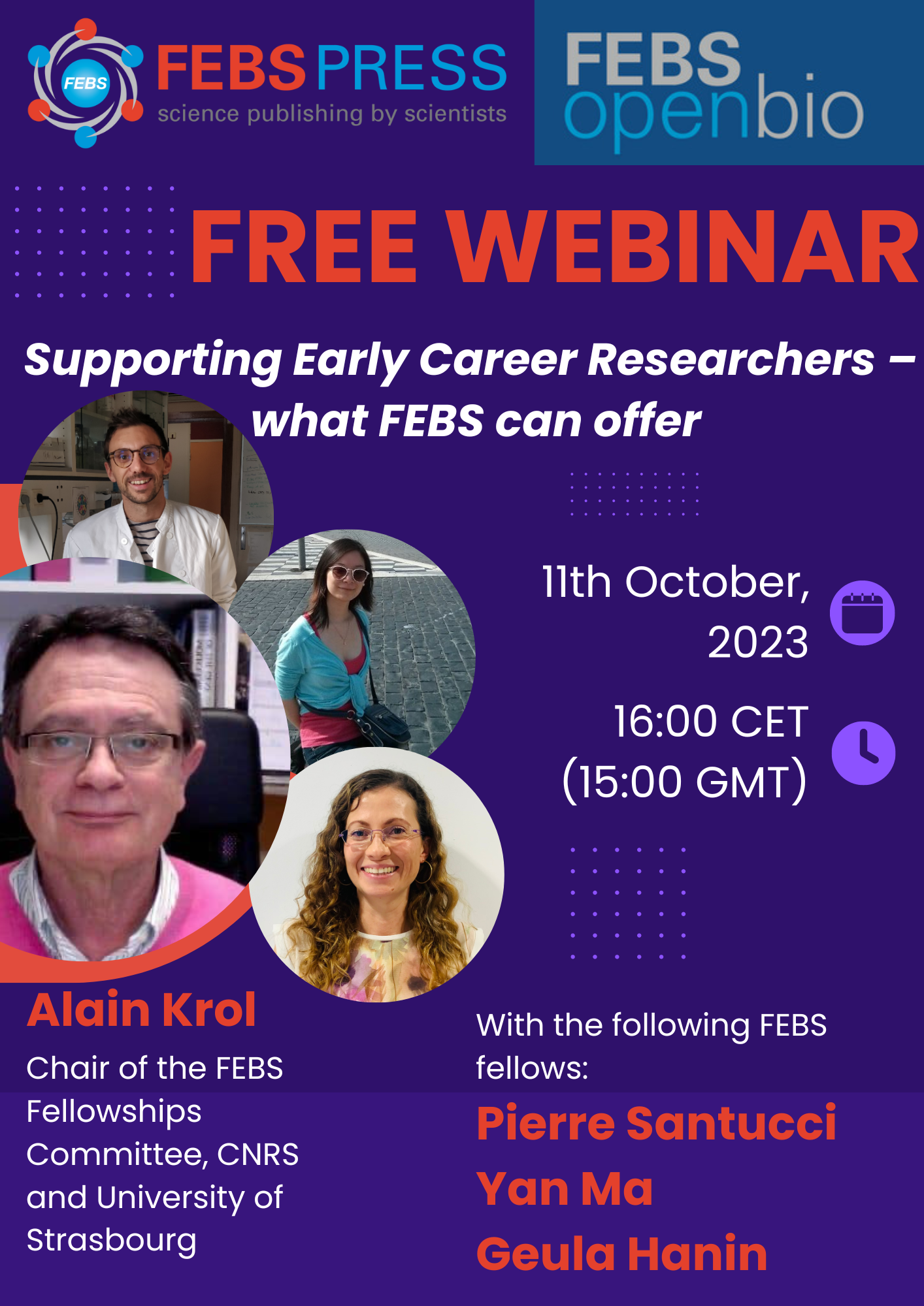 We are pleased to announce an upcoming free FEBS Open Bio webinar, which will be held on Zoom on 11th October 2023 at 16:00 CEST (15:00 BST). Prof. Alain Krol (Chair of the FEBS Fellowships Committee, CNRS and University of Strasbourg) and three FEBS fellows will discuss how FEBS can help ECRs.