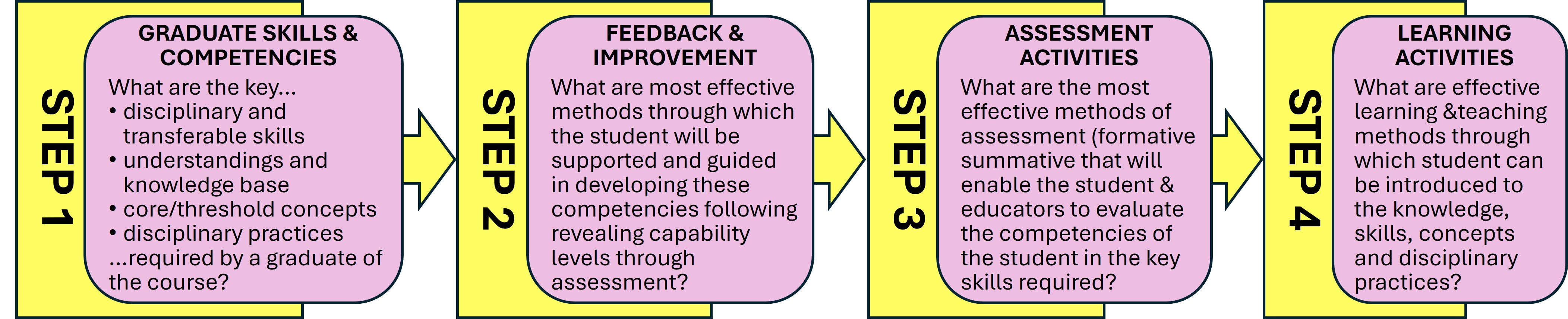Figure 1 – The ‘backwards’ design of a curriculum. Successive steps of effective curriculum design embedding constructive alignment. Key graduate outcomes are defined, before feedback and improvement, which then informs the assessment strategy that can demonstrate competence in the outcomes, which then informs the ideal learning and teaching activities that best support development of the outcomes.