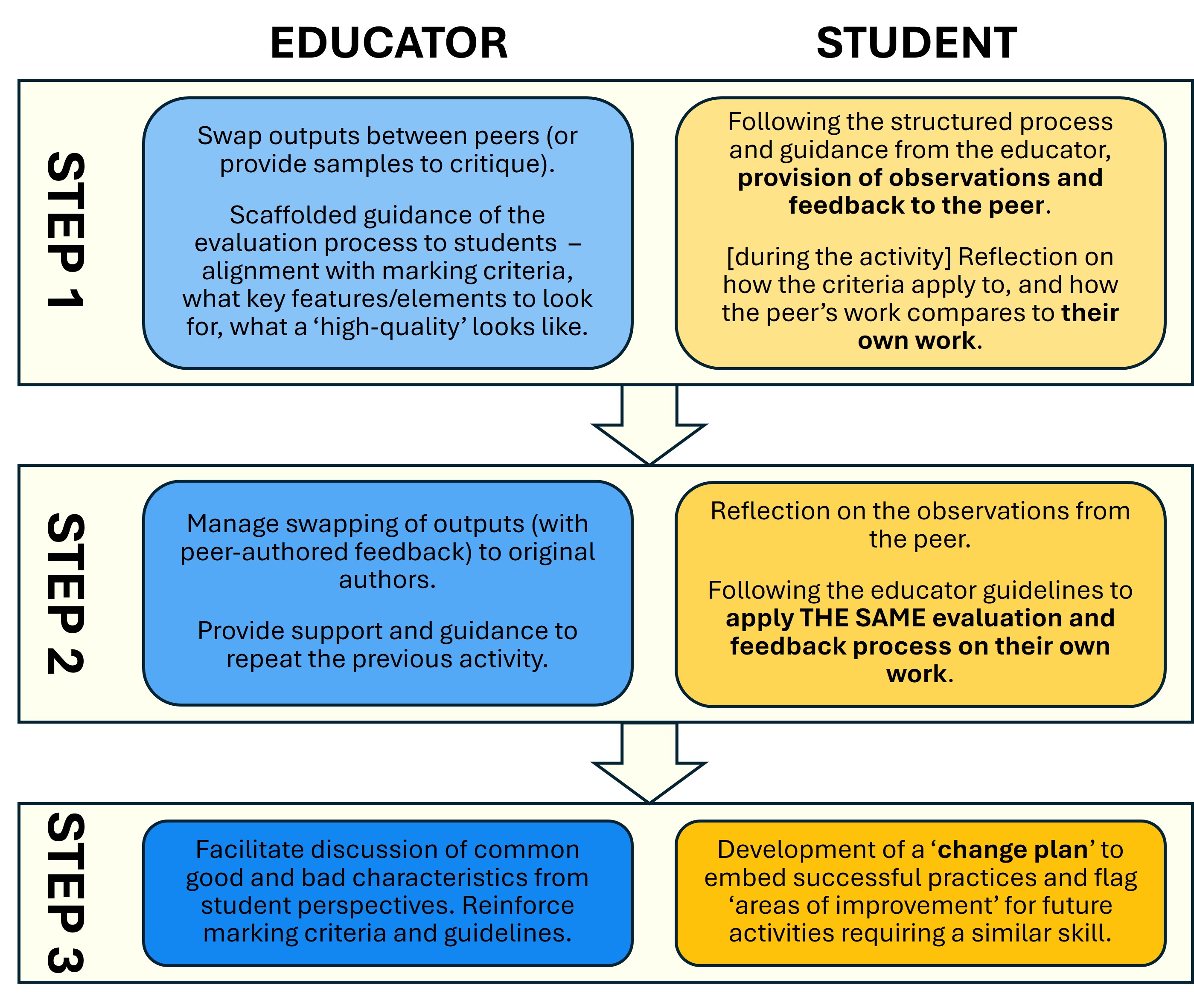 Facilitated peer-feedback activities are potentially powerful in supporting the development of shared-regulation skills, as well as self-regulation. Peer feedback, however, is often used poorly, merely as a means for students to receive feedback from their peers. This is of limited use to a student, for whom feedback from an expert may be more effective (and is usually more welcome) (van Blankenstein et al., 2024). The true benefit of peer feedback lies in the process of supporting the learner’s self-feedback skills, and using the act of reviewing the work of their peers as a medium for developing their own self-critical skills. A suggested process for this, taken from Rutherford et al. (2025) is included in Figure 2. The process of peer feedback is a facilitated one, with the educator guiding the learners through the feedback process. Then the important step is the last stage, where the individuals use the experience of providing feedback information to their peer, to provide the same critique to themselves. This process not only encourages students to interact socially in an effective way, but also to utilise the effects of that social interaction for their own learning gain.
