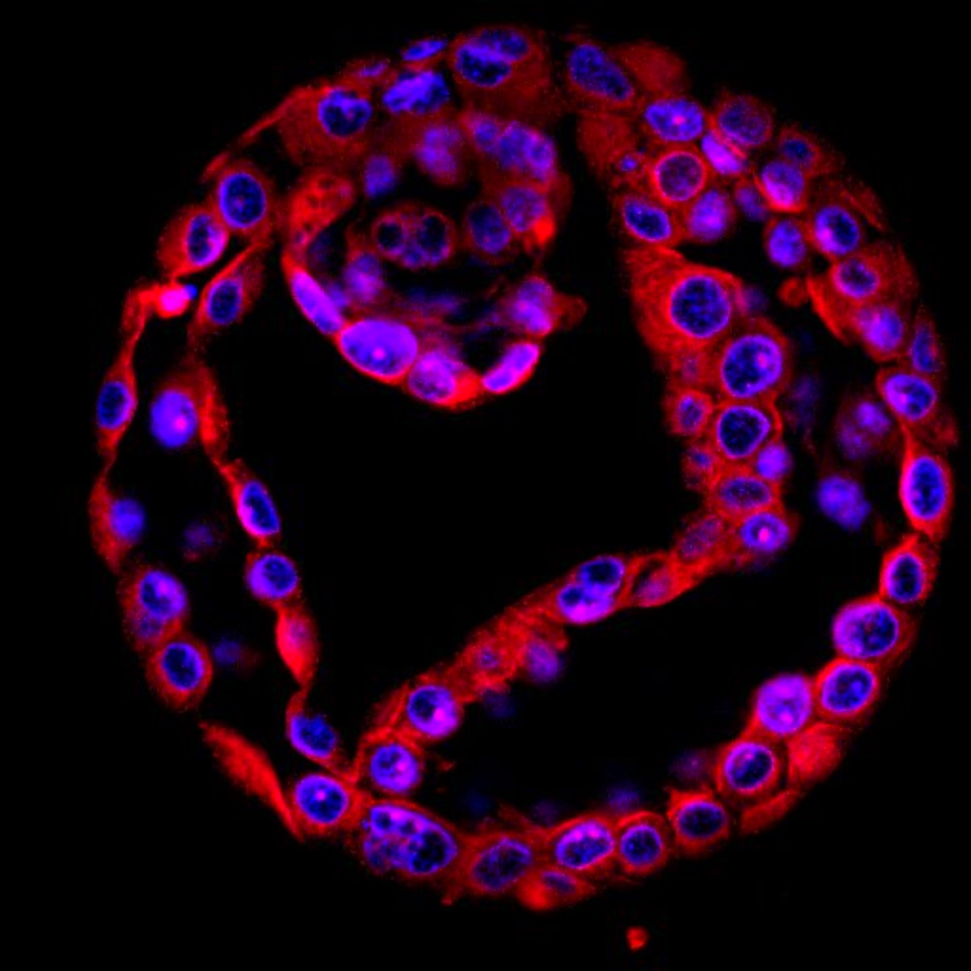 For the Bio-Art image Contest, I chose a confocal microscopy image titled “Yin & Yang in breast cancer mammospheres”. It shows MCF7 breast cancer cells forming a mammosphere. Our research team has demonstrated that the tumor suppressor SET9 plays a crucial role in the formation and differentiation of mammospheres in MCF7 breast cancer cells. Our studies show that the loss of SET9 activity represents a molecular link between epithelial-mesenchymal transition (EMT) and the generation of cells with stem cell-like properties. In my image, we can observe that SET9 in MCF7 cells increases the ability to form mammospheres, as evidenced by a high expression of the epithelial marker E-cadherin (in red) and a low expression of SOX2 (in green). The nuclei of the cells were stained in blue. However, in other experiments where we silenced SET9, these mammospheres undergo EMT transformation in just four days without the need for additional cell reseeding or stem cell-inducing growth factors.
